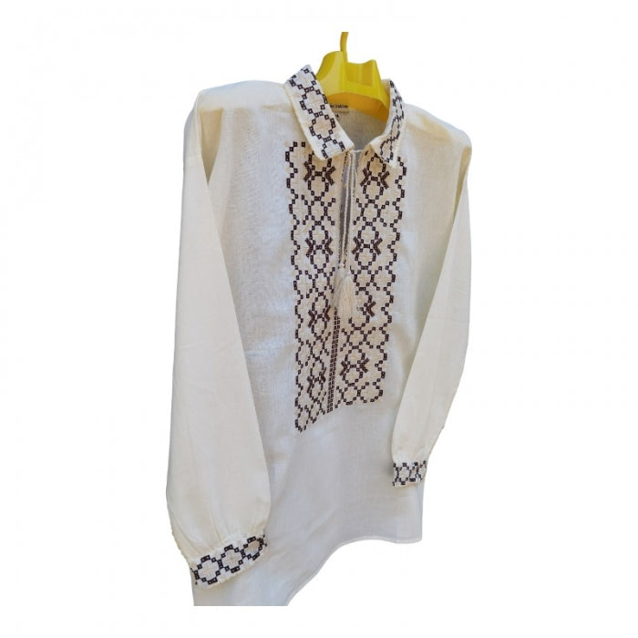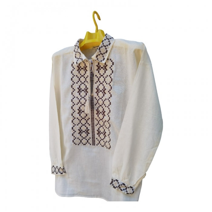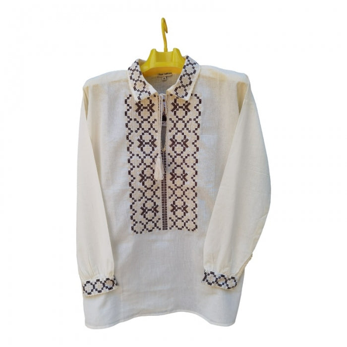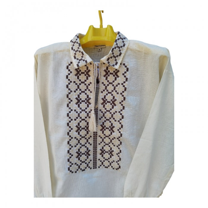Camasa are o culoare bej, iar gulerul sau este de tip tunica. Broderiile traditionale adauga un element distinctiv si autentic acestui design. Aceasta camasa poate fi purtata cu mandrie la evenimente speciale sau ca parte a unei tinute traditionale pentru a celebra cultura si mostenirea ta. Este o alegere frumoasa pentru cei care doresc sa imbine traditia cu modernitatea in moda lor.