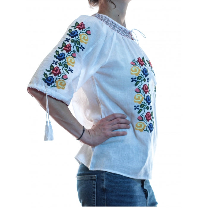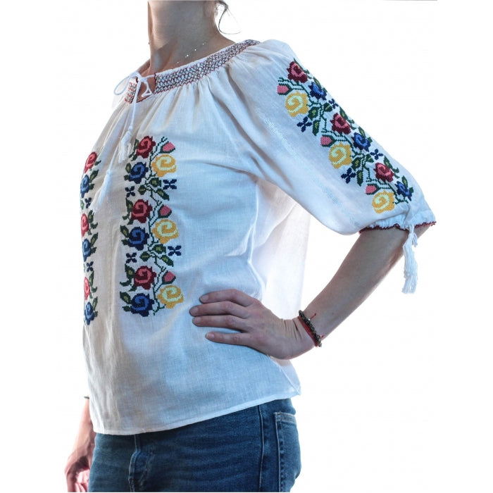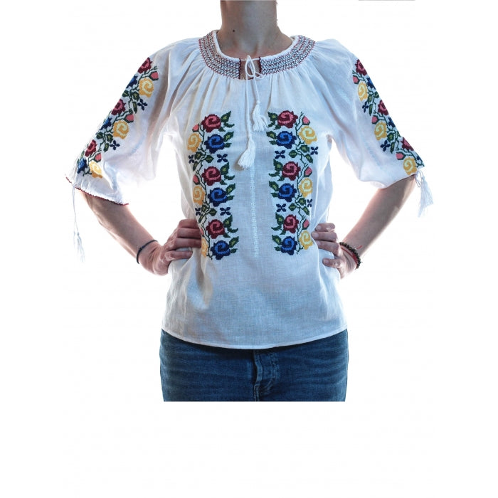 Ie romaneasca cu model traditional brodat la masina. Compozitie bumbac 100%.