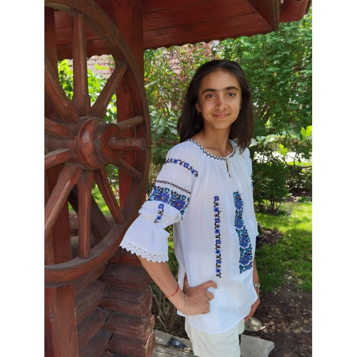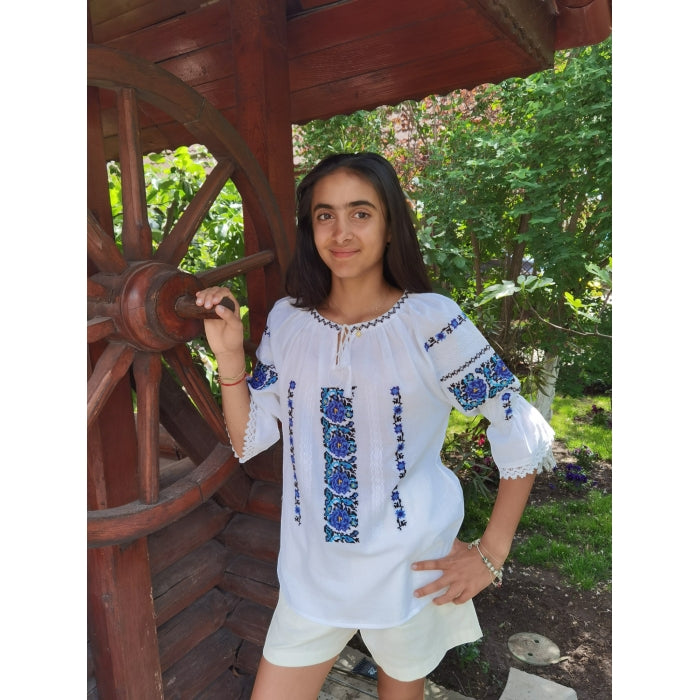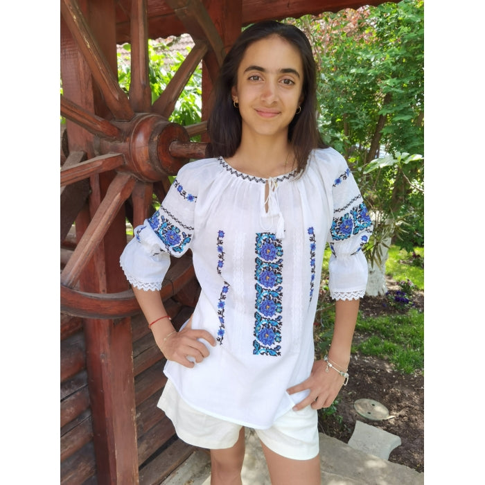 Ie Tradițională Albă din Bumbac cu Broderie Florala Albastra – Mâneci Trei Sferturi