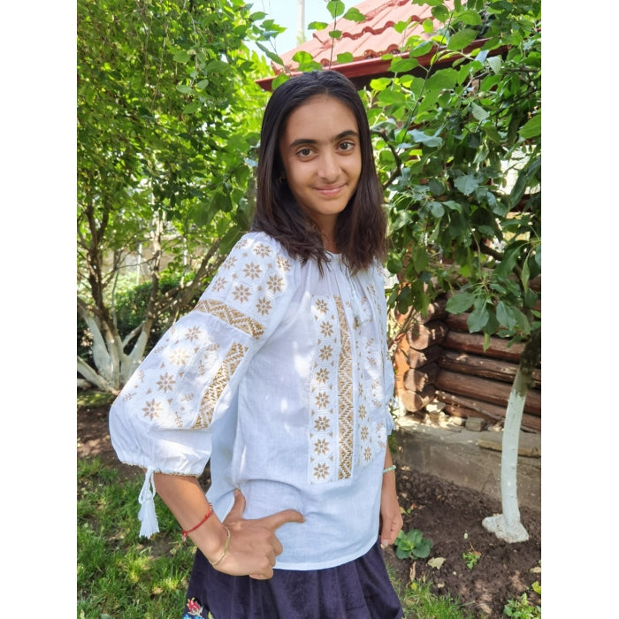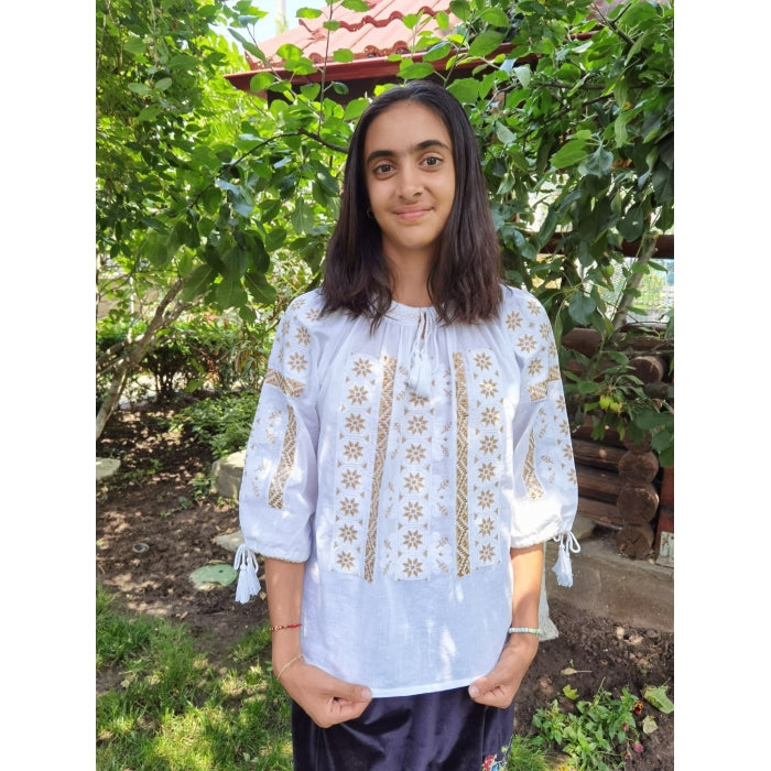 Ie tradițională albă pentru femei, broderie bej, mânecă trei sferturi – model autentic românesc