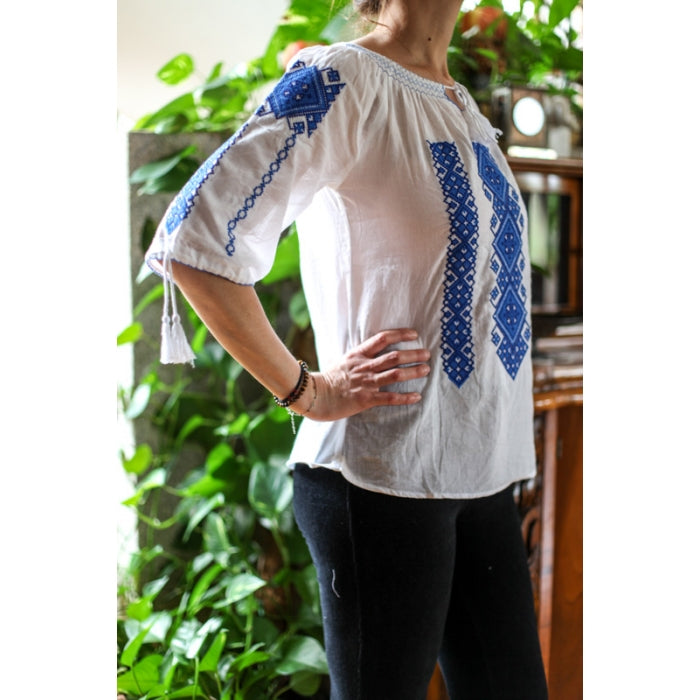 Panza plina, netransparenta, broderie bogata, iesita in relief si maneci trei sferturi - aceasta ie romaneasca stilizata este o achizitie perfecta pentru garderoba ta.