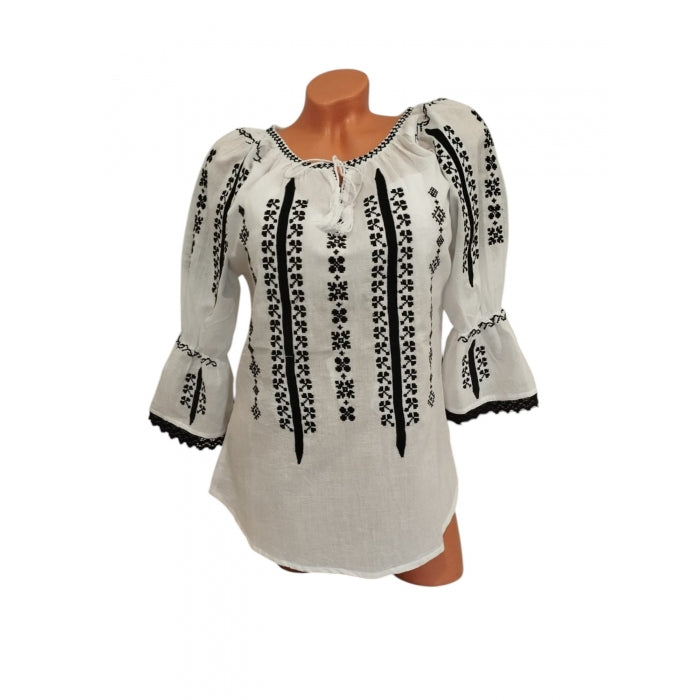 Această ie românească autentică cu mâneci trei sferturi este confecționată din bumbac natural de cea mai înaltă calitate, oferind atât confort, cât și durabilitate. Decorată cu broderii tradiționale roșii și negre, această ie aduce un omagiu moștenirii culturale românești, fiind perfectă pentru evenimente speciale sau pentru a adăuga o notă de autenticitate garderobei tale zilnice.