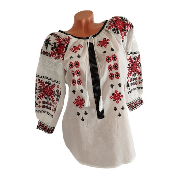 Această ie românească autentică cu mâneci trei sferturi este confecționată din bumbac natural de cea mai înaltă calitate, oferind atât confort, cât și durabilitate. Decorată cu broderii tradiționale roșii și negre, această ie aduce un omagiu moștenirii culturale românești, fiind perfectă pentru evenimente speciale sau pentru a adăuga o notă de autenticitate garderobei tale zilnice.