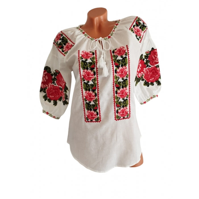 Această ie românească autentică cu mâneci trei sferturi este confecționată din bumbac natural de cea mai înaltă calitate, oferind atât confort, cât și durabilitate. Decorată cu broderii tradiționale roșii și negre, această ie aduce un omagiu moștenirii culturale românești, fiind perfectă pentru evenimente speciale sau pentru a adăuga o notă de autenticitate garderobei tale zilnice.