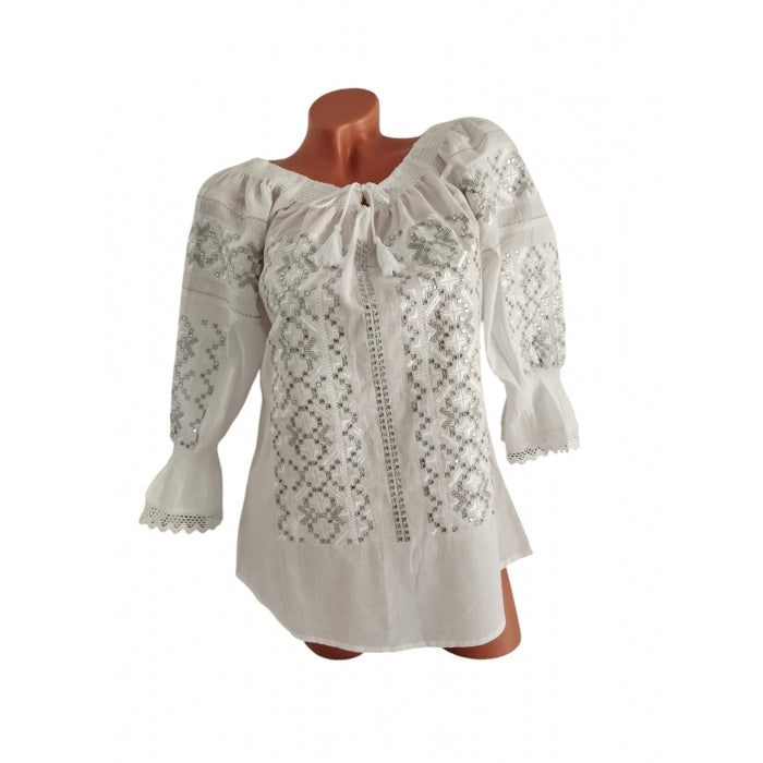 Descoperă frumusețea autentică a culturii românești prin intermediul Iei Tradiționale Andrada2, o piesă vestimentară brodată la mașină, realizată cu mândrie din pânză de bumbac 100%. Această ie reprezintă o veritabilă capodoperă a meșteșugului tradițional, transmițând atât simbolism cât și rafinament în fiecare cusătură.