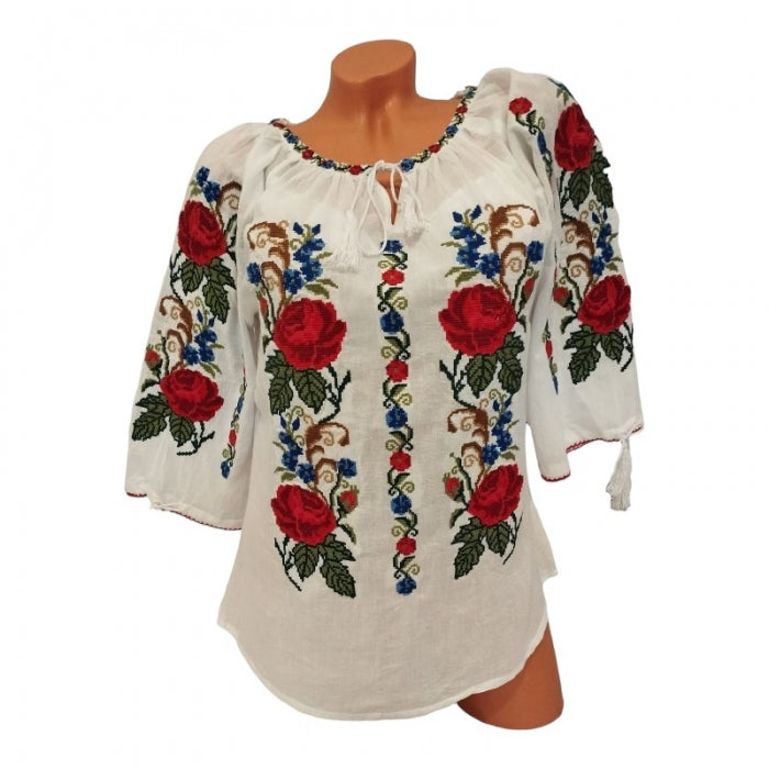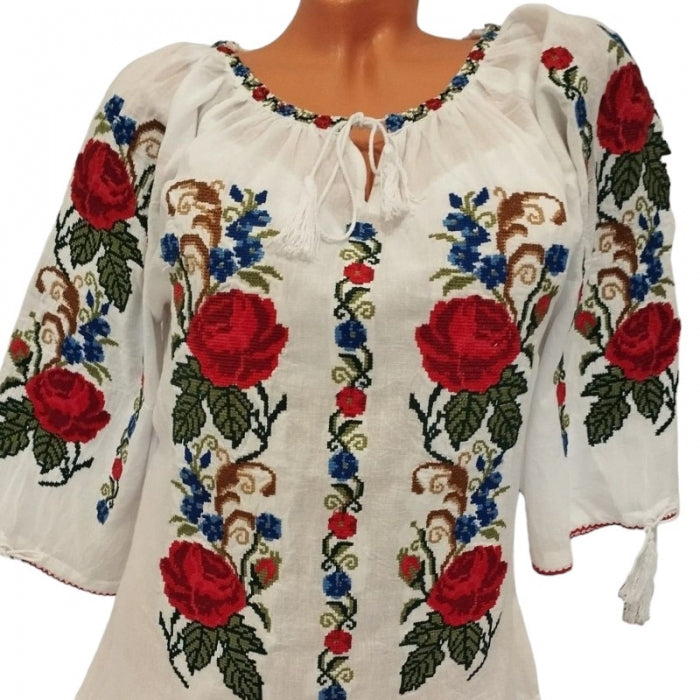 Ie romaneasca brodata cu motive romanesti traditionale pe panza pe bumbac 100%, broderie cusuta la masina. MODEL DISPONIBIL DOAR CU MANECA LUNGA!
