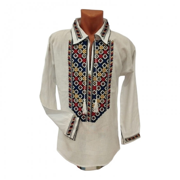 Ia barbat este confectionata din bumbac 100%, in nuanta alba, si are o croiala lejera, cu maneci lungi si guler rotund. Broderia este la masina, realizata cu fir de bumbac, si reprezinta motive florale si geometrice.