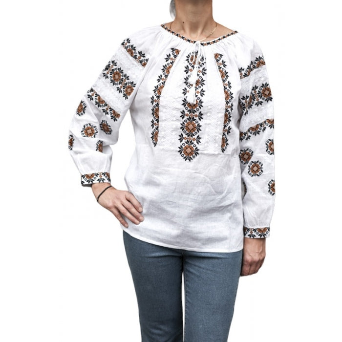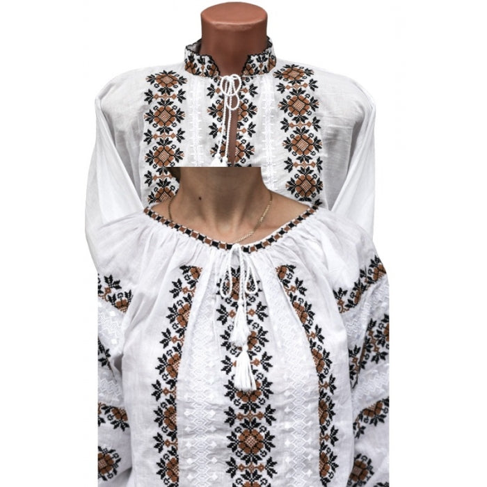 Ia dama este confectionata din bumbac 100%, in nuanta alba, si are o croiala lejera, cu maneci lungi si guler rotund. Broderia este la masina, realizata cu fir de bumbac, si reprezinta motive florale si geometrice.
