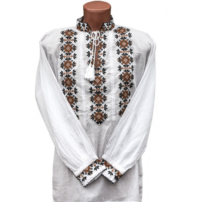 Ia barbat este confectionata din bumbac 100%, in nuanta alba, si are o croiala lejera, cu maneci lungi si guler rotund. Broderia este la masina, realizata cu fir de bumbac, si reprezinta motive florale si geometrice.