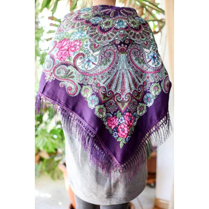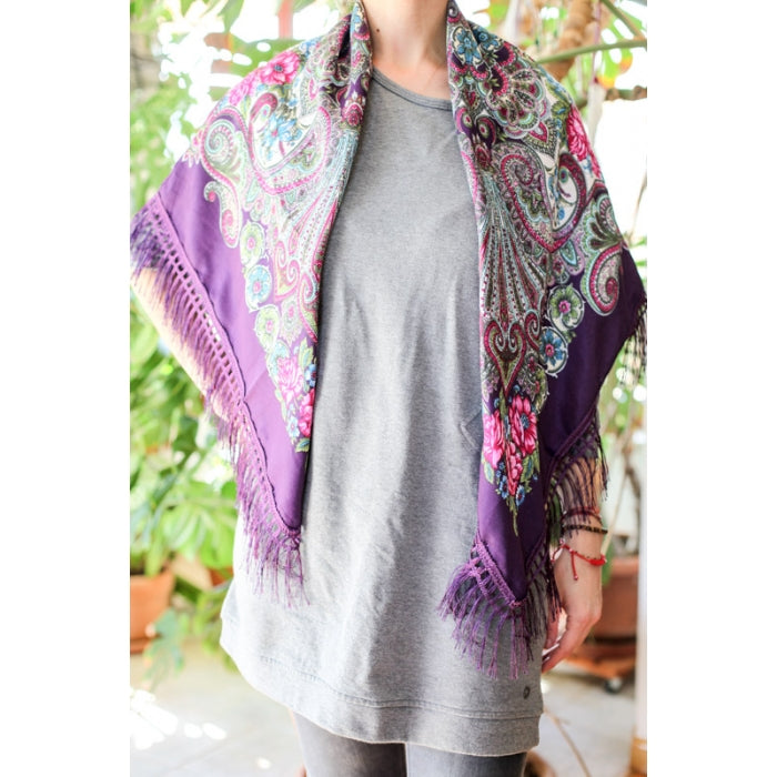 Batic cu motive traditionale inflorat cu franjuri mov2