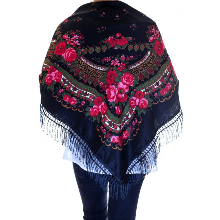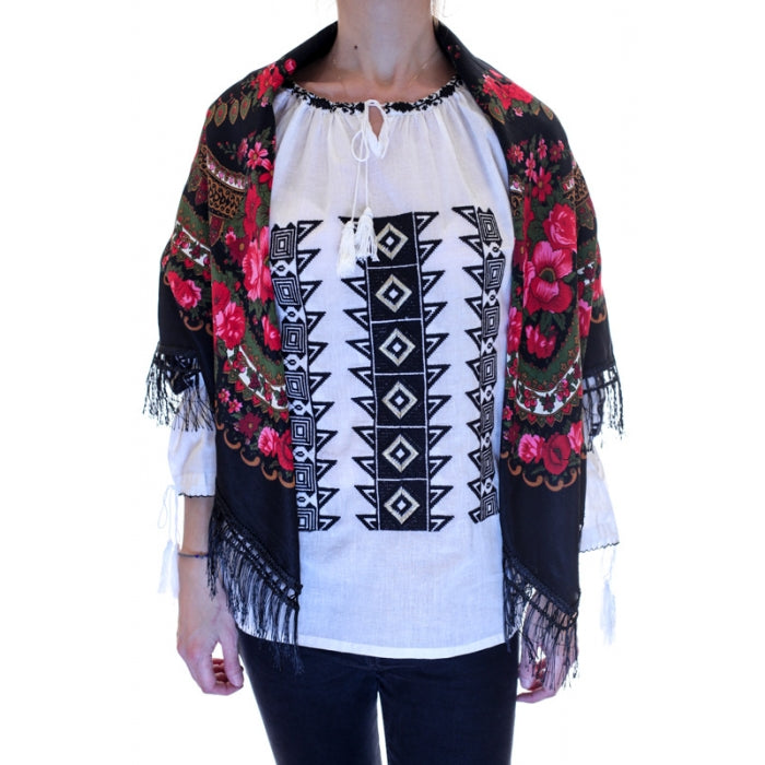 Batic cu motive traditionale inflorat cu franjuri negru3