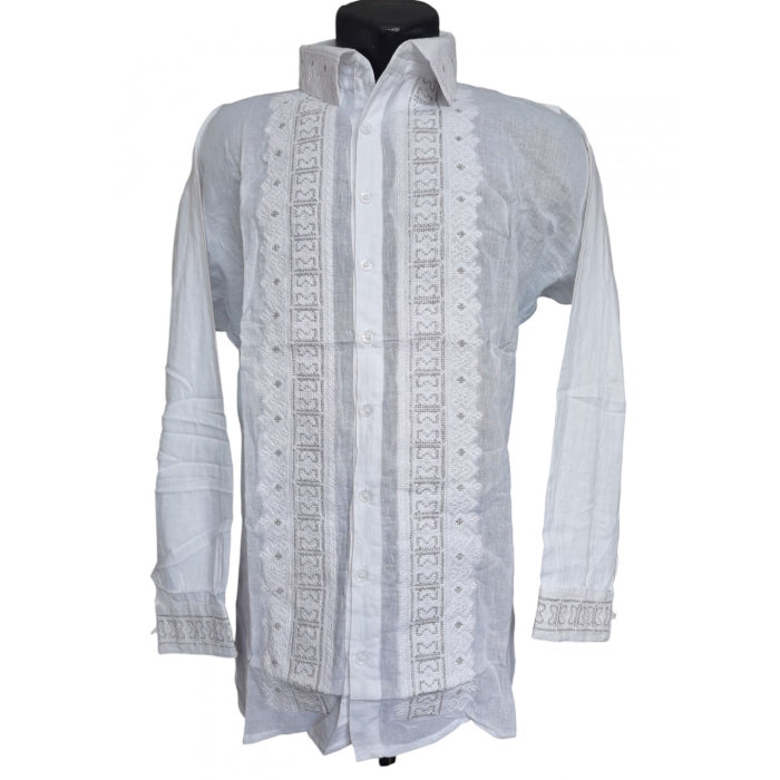 Această cămașă tradițională pentru bărbați îmbină armonios eleganța modernă cu farmecul autentic al portului românesc. Realizată din pânză de bumbac natural, ușoară și respirabilă, este decorată cu broderie albă geometrică, lucrată cu finețe, ce evocă simbolurile strămoșești ale tradiției românești.