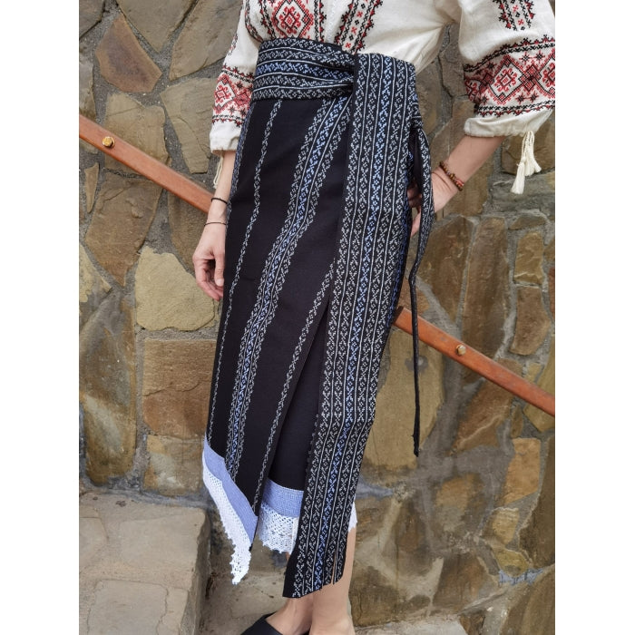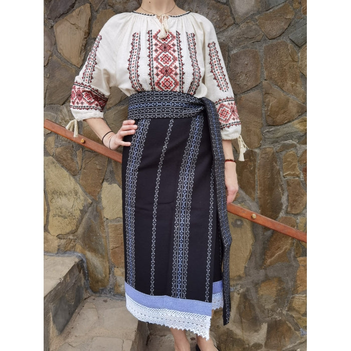 Acest set tradițional conține o catrintă și un brâu realizate din stofă cu lână (58% lână) și broderie cusută la mașină, inspirată din tradițiile românești. Catrinta are tivul decorat cu dantelă și vine cu o căptușeală din nylon, pentru confort sporit. Sistemul de prindere petrecut în talie este ajustabil cu ajutorul capselor metalice, oferind flexibilitate în purtare.