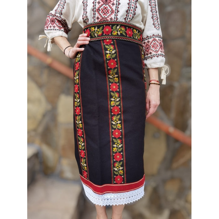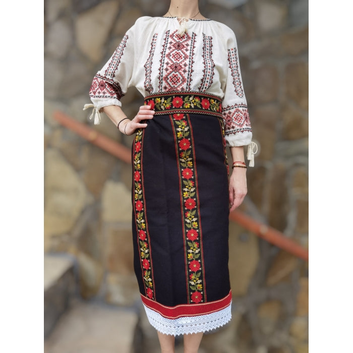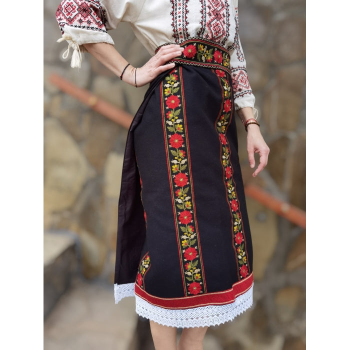 Acest set tradițional conține o catrintă și un brâu realizate din stofă cu lână (58% lână) și broderie cusută la mașină, inspirată din tradițiile românești. Catrinta are tivul decorat cu dantelă și vine cu o căptușeală din nylon, pentru confort sporit. Sistemul de prindere petrecut în talie este ajustabil cu ajutorul capselor metalice, oferind flexibilitate în purtare.