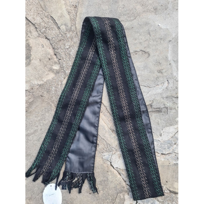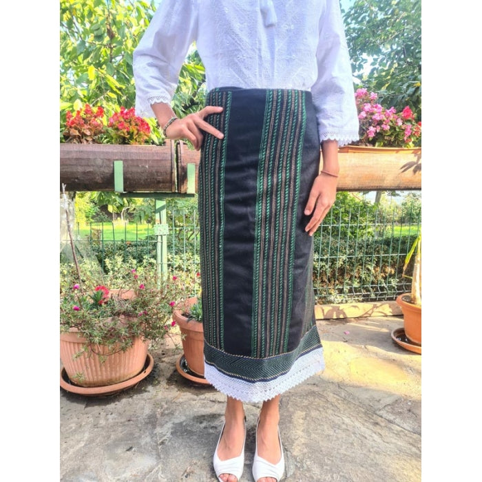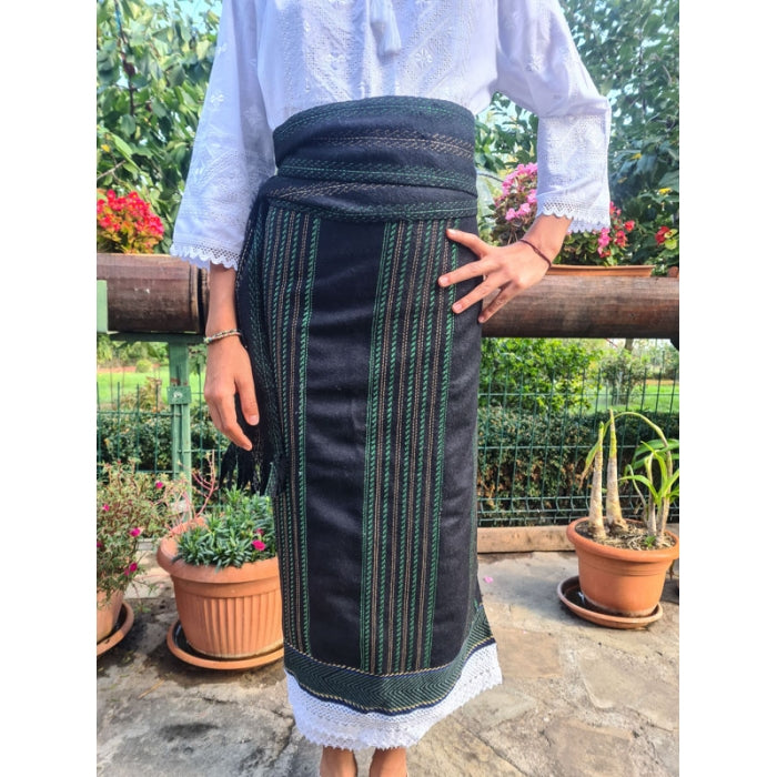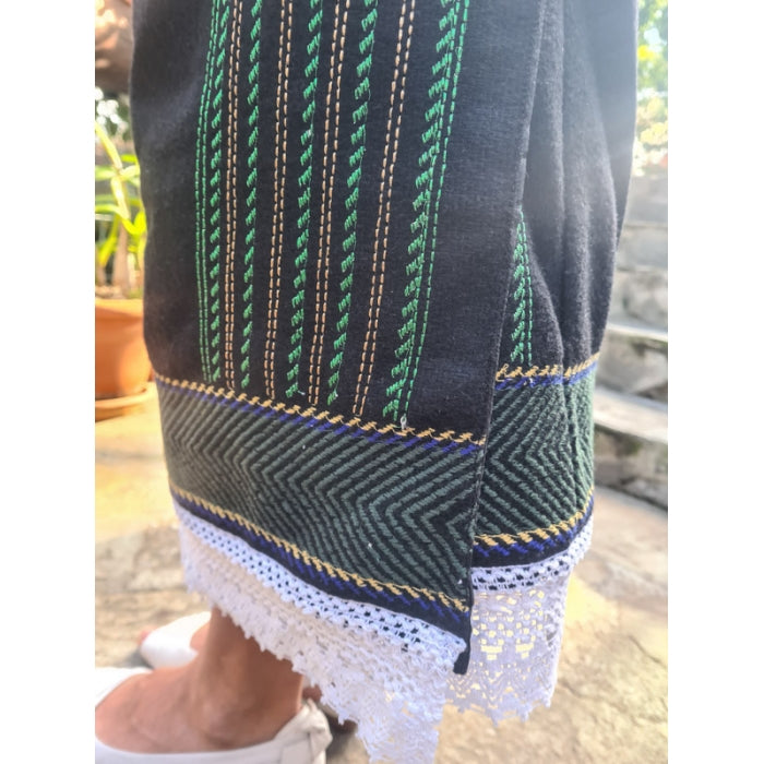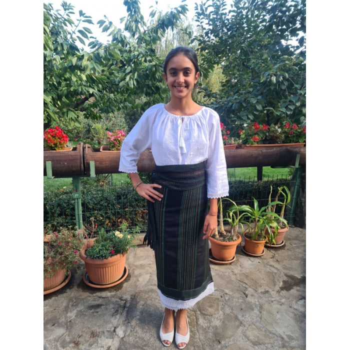 Acest set tradițional conține o catrintă și un brâu realizate din stofă cu lână (58% lână) și broderie cusută la mașină, inspirată din tradițiile românești. Catrinta are tivul decorat cu dantelă și vine cu o căptușeală din nylon, pentru confort sporit. Sistemul de prindere petrecut în talie este ajustabil cu ajutorul capselor metalice, oferind flexibilitate în purtare.