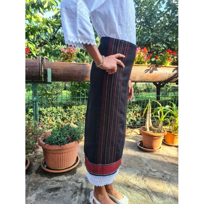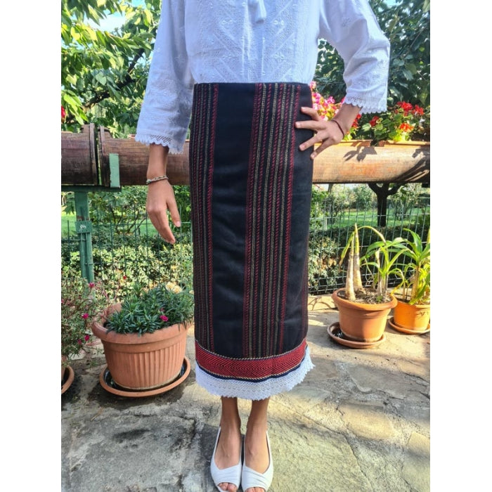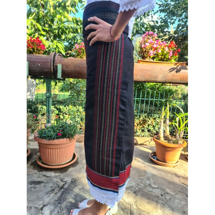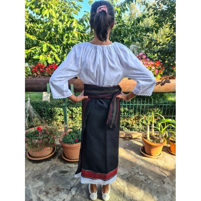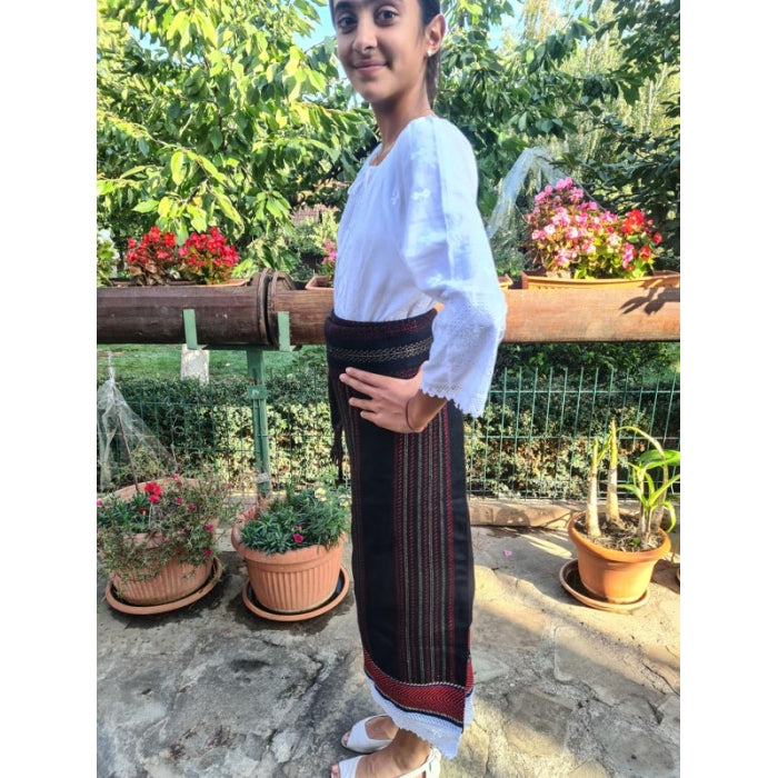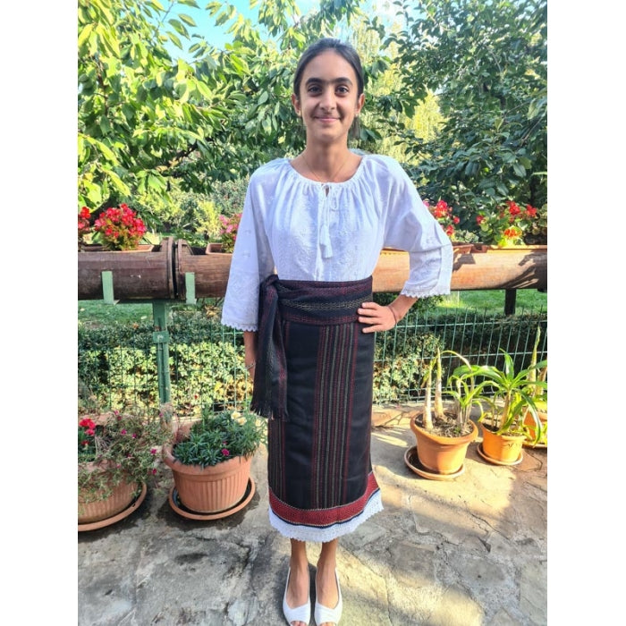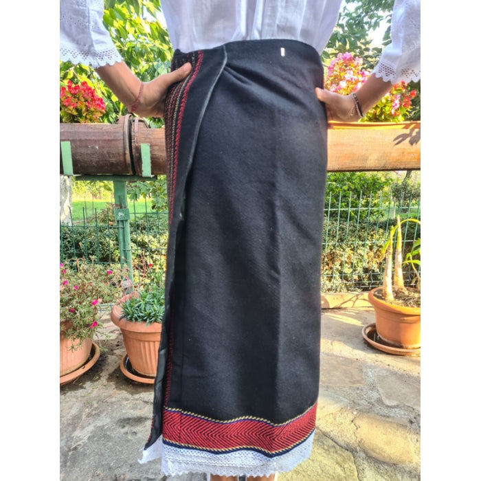 Acest set tradițional conține o catrintă și un brâu realizate din stofă cu lână (58% lână) și broderie cusută la mașină, inspirată din tradițiile românești. Catrinta are tivul decorat cu dantelă și vine cu o căptușeală din nylon, pentru confort sporit. Sistemul de prindere petrecut în talie este ajustabil cu ajutorul capselor metalice, oferind flexibilitate în purtare.