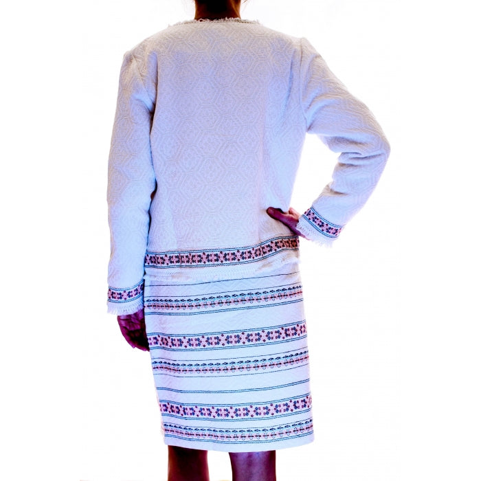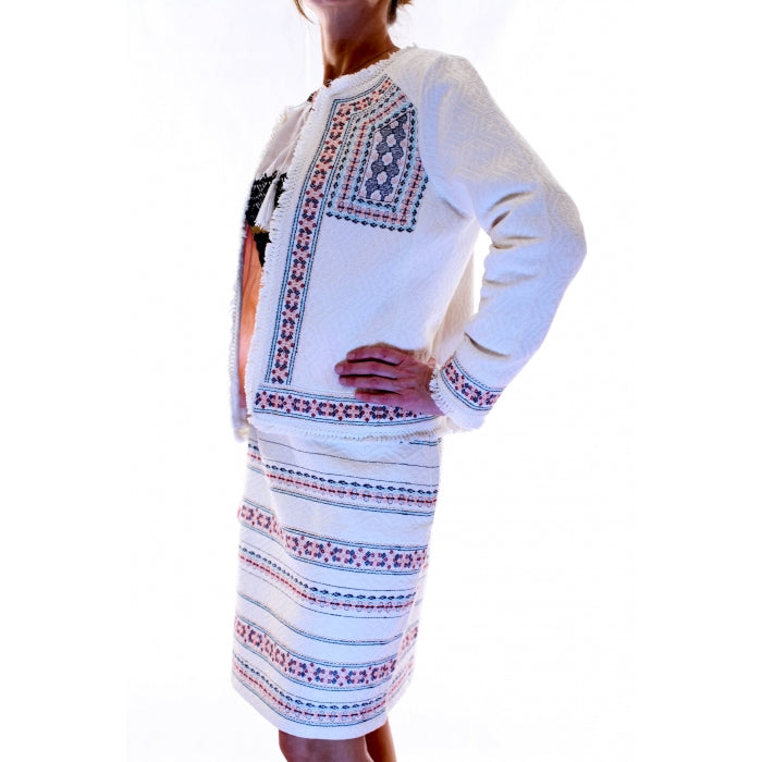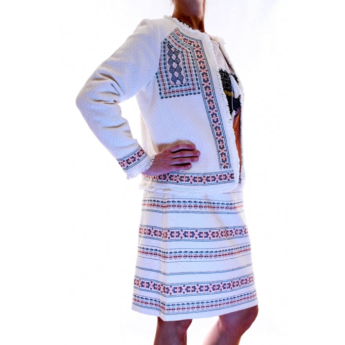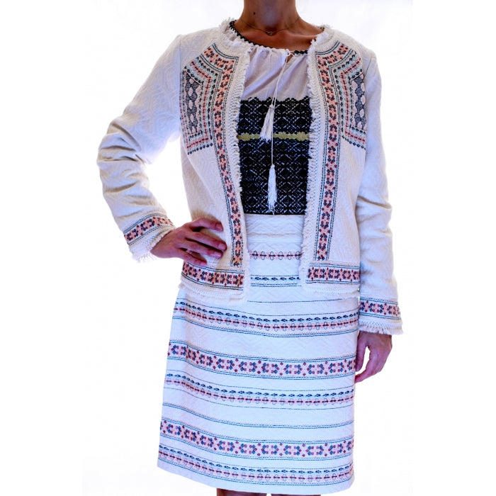 Costum din doua piese format din sacou scurt si drept si fusta dreapta, din tesatura texturata bumbac 100%.