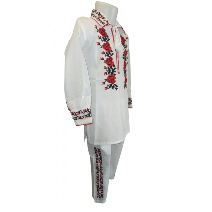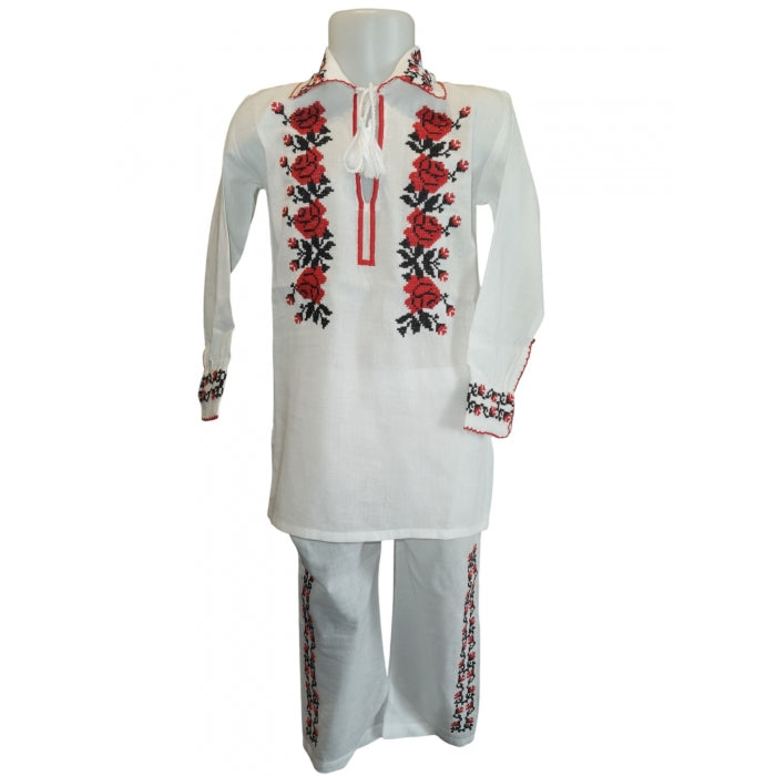 Costum Traditional Baieti format din pantaloni si camasa,brodat la masina cu insertii aplicate de model traditional national romanesc. Material din bumbac 100%