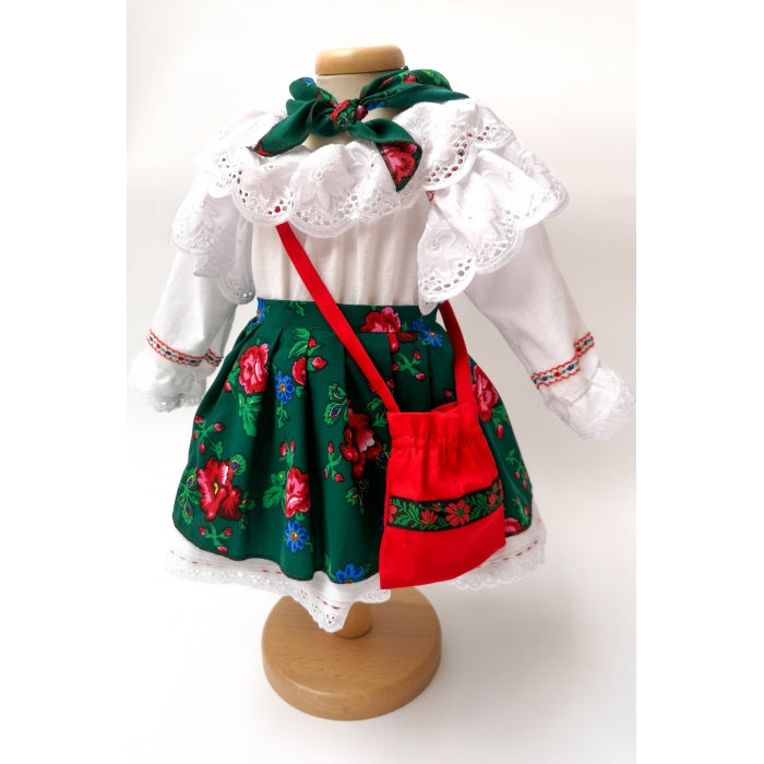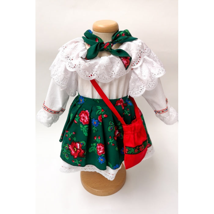 Costum traditional pentru botez sau orice eveniment important. Setul contine: camasa bumbac, fustita, batic si traista.