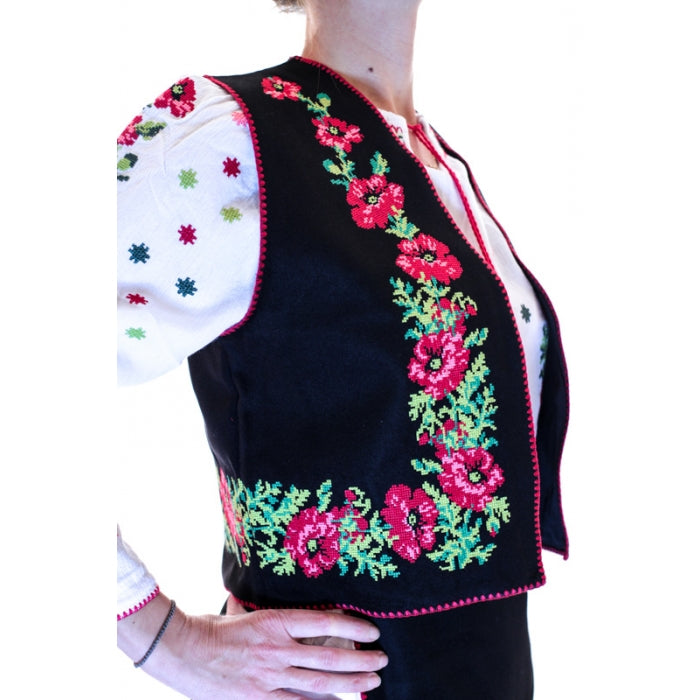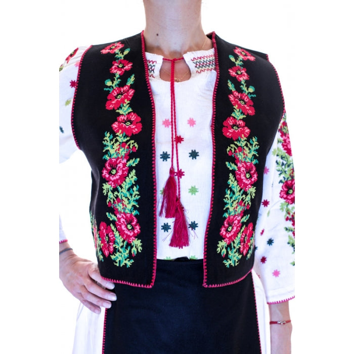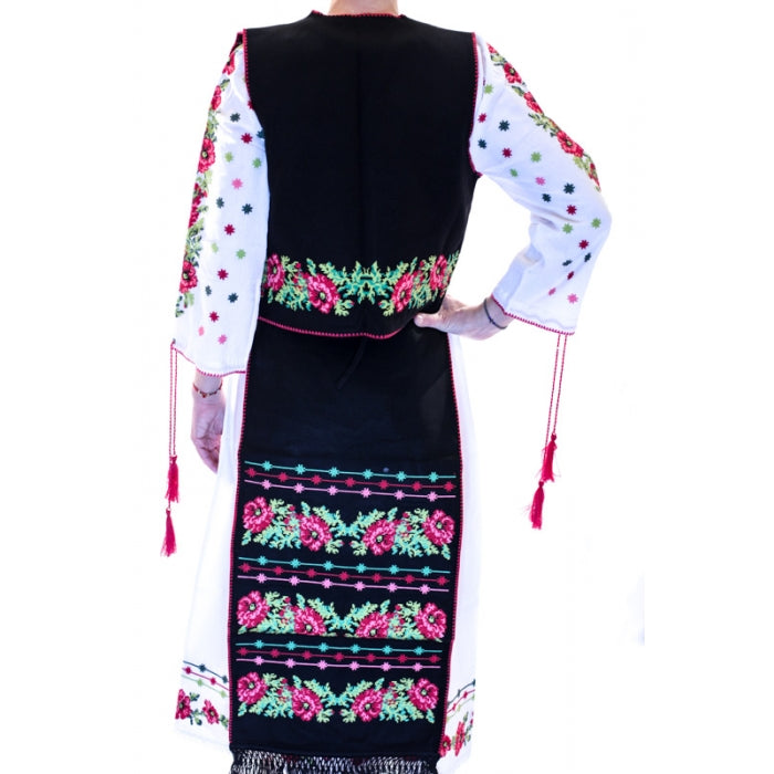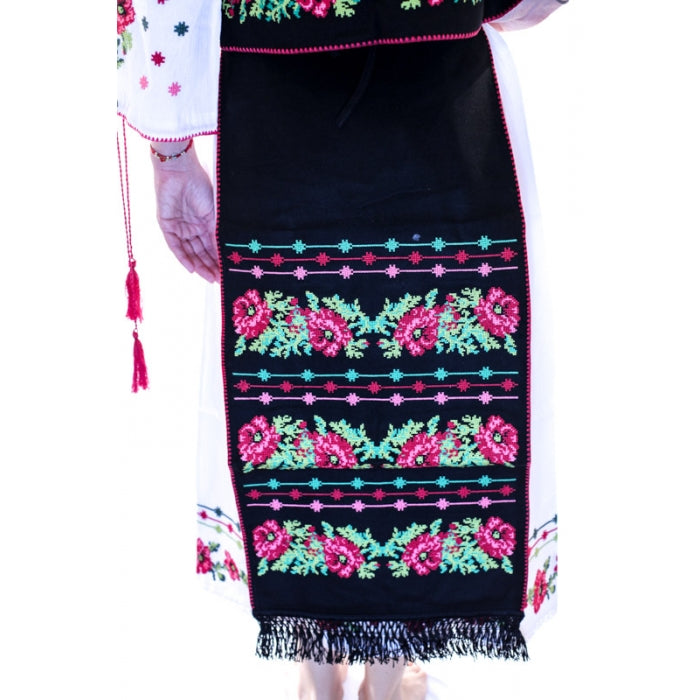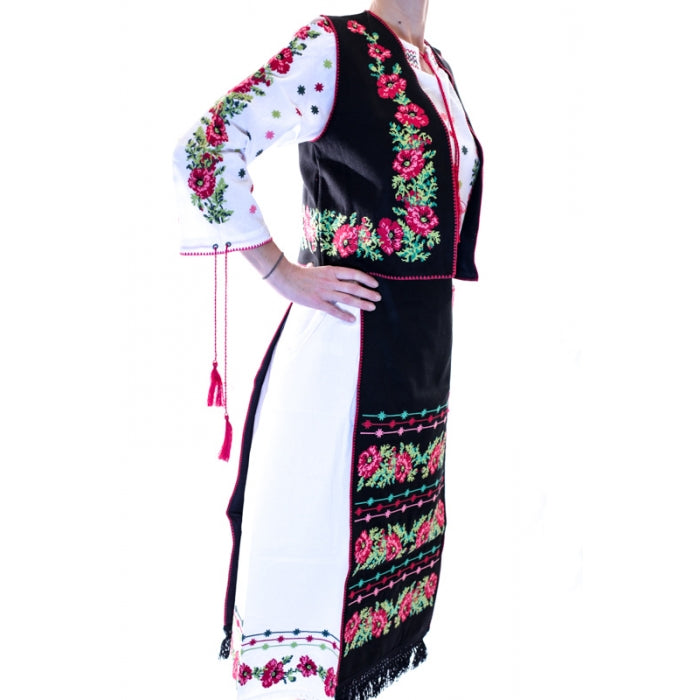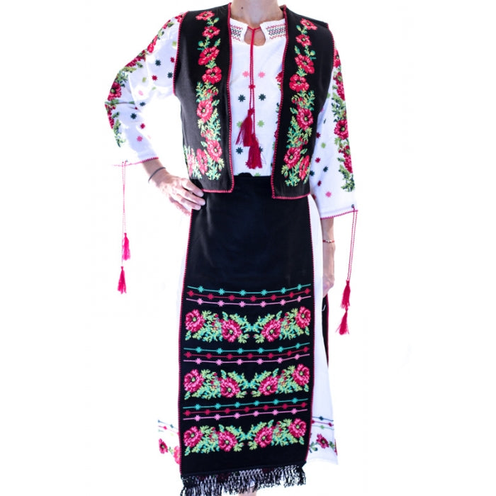 Setul contine: vesta, doua fote/catrinte fata/spate.ie stilizata,fusta. Dimensiuni fote: lungime 70 (fara franjuri), latime 35 cm.