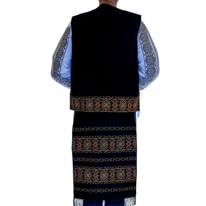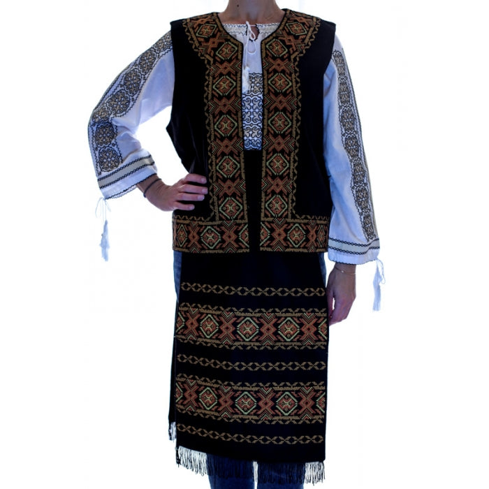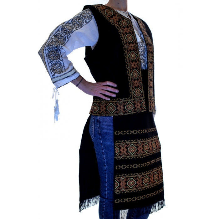 Setul contine: vesta, doua fote/catrinte fata/spate. Dimensiuni fote: lungime 70 (fara franjuri), latime 35 cm.