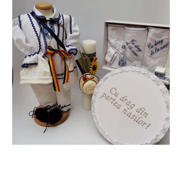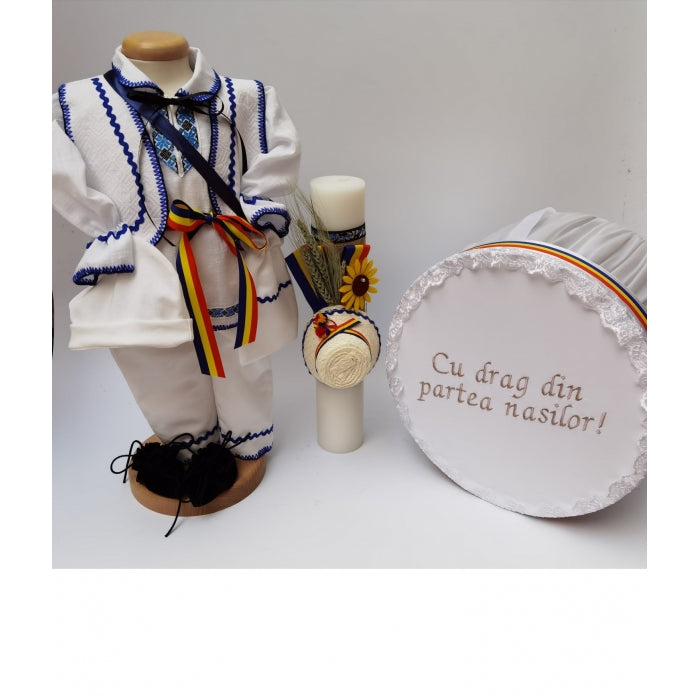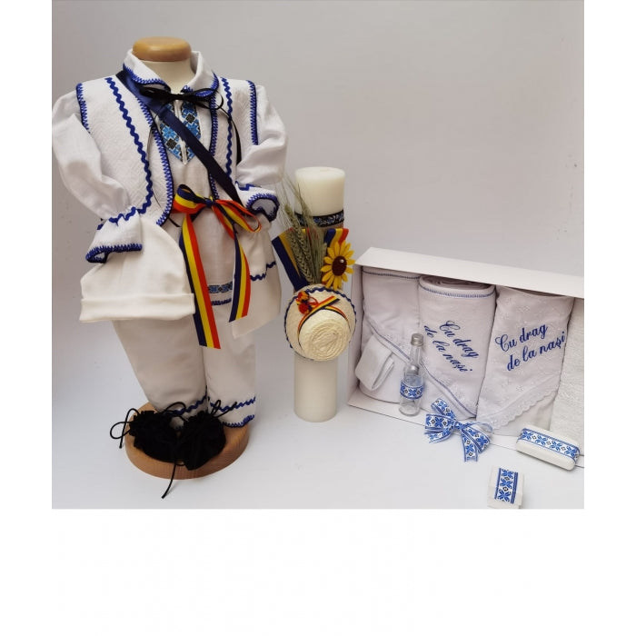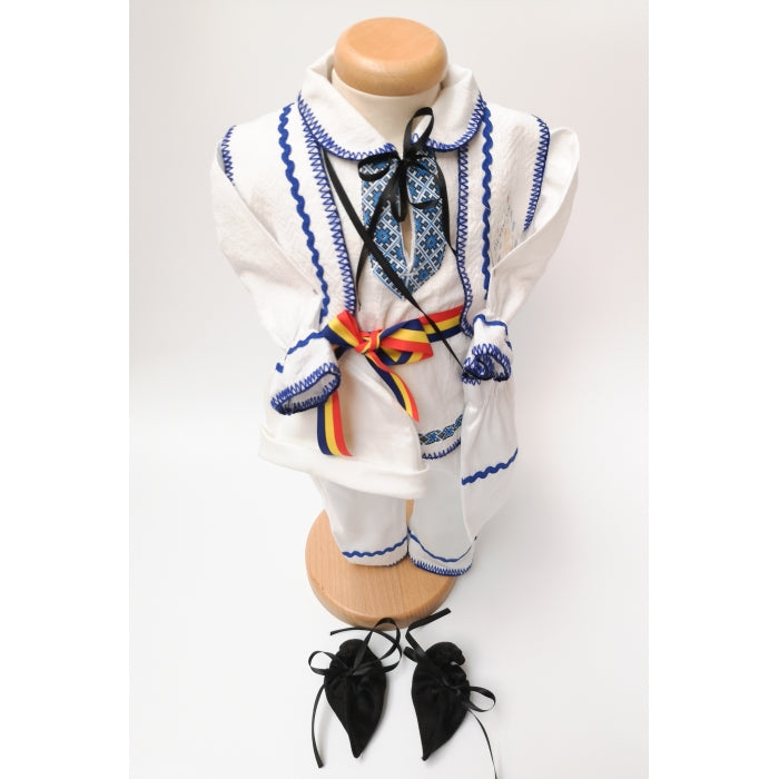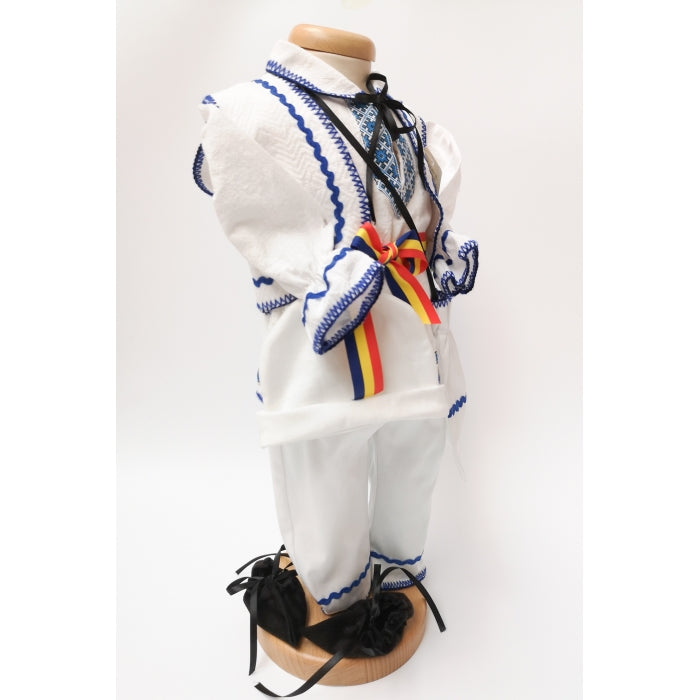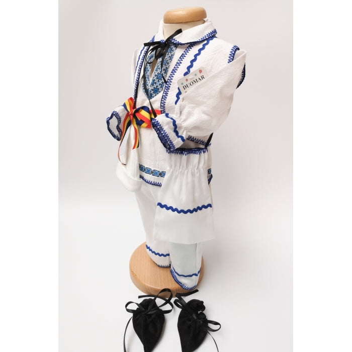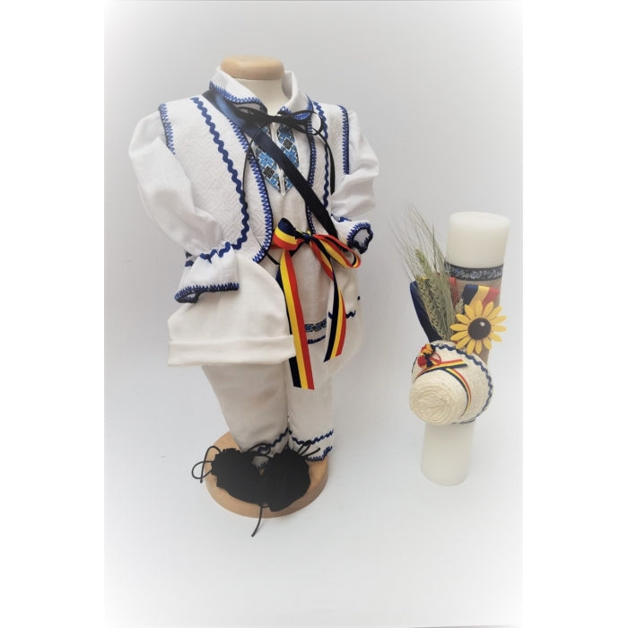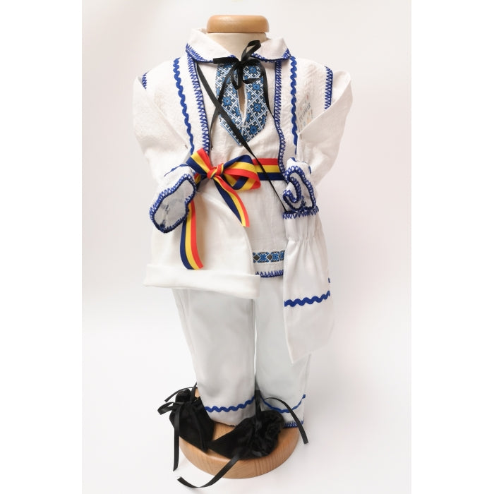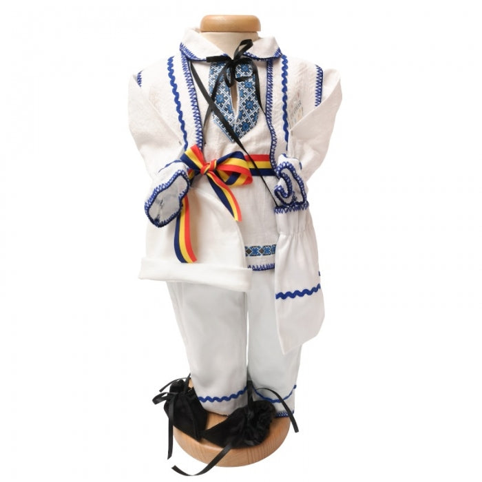 Costumas popular traditional romanesc pentru botez. Include camasa bumbac, vesta, pantalon, opincute, caciulita, brau, tolba.