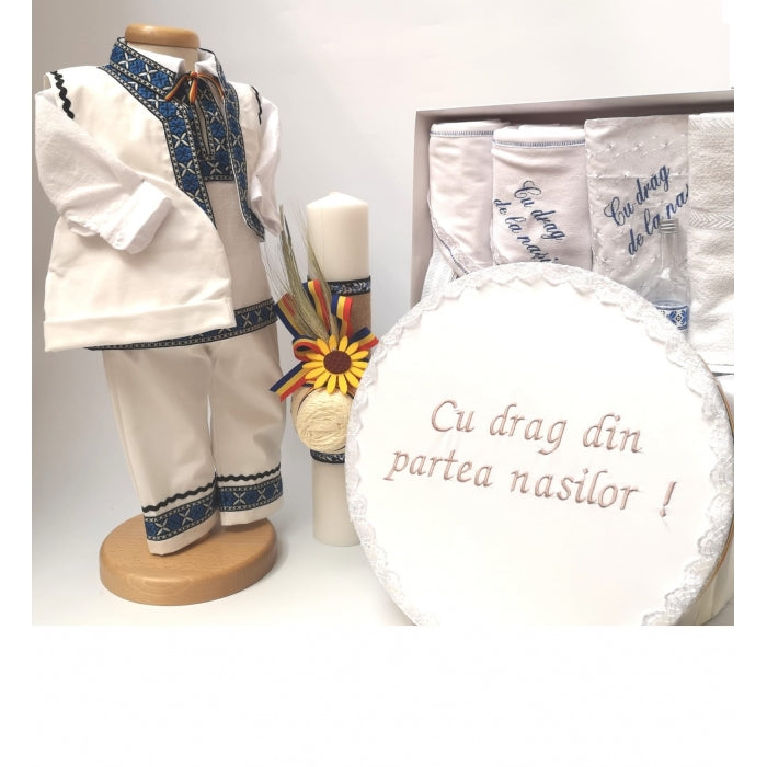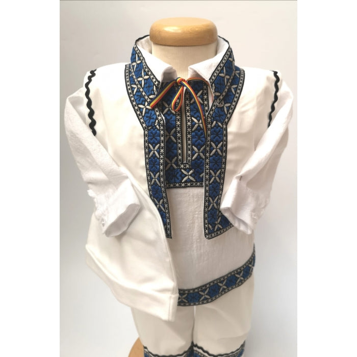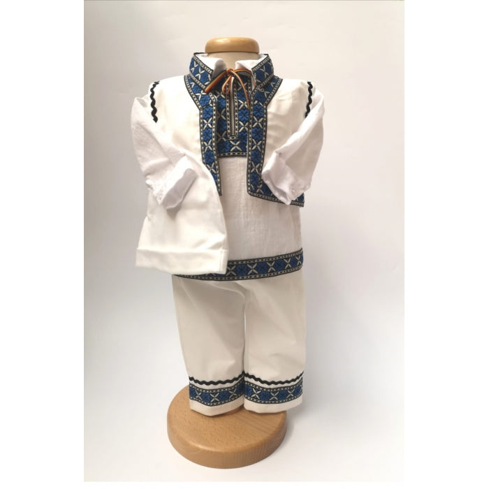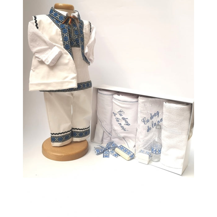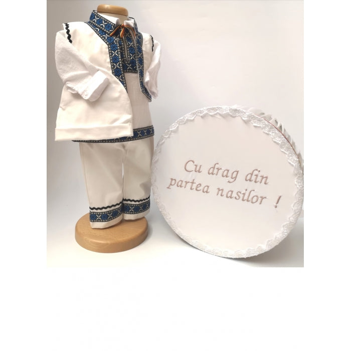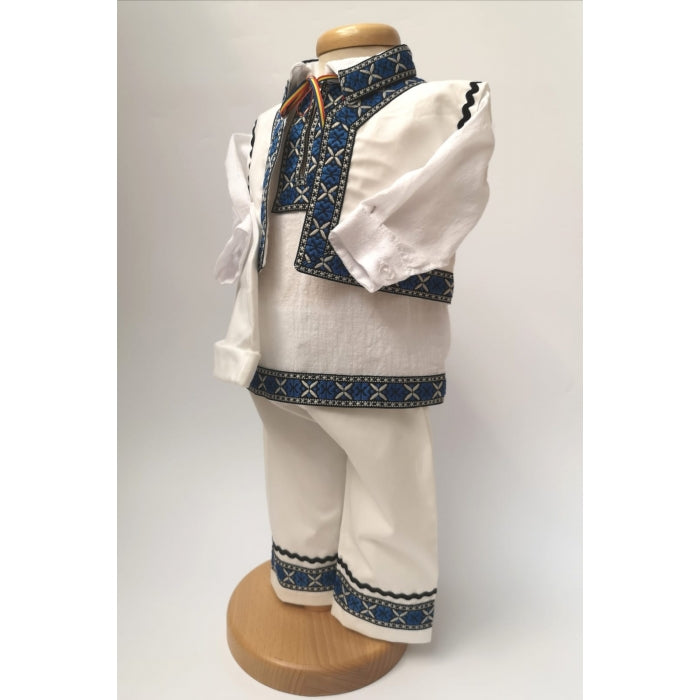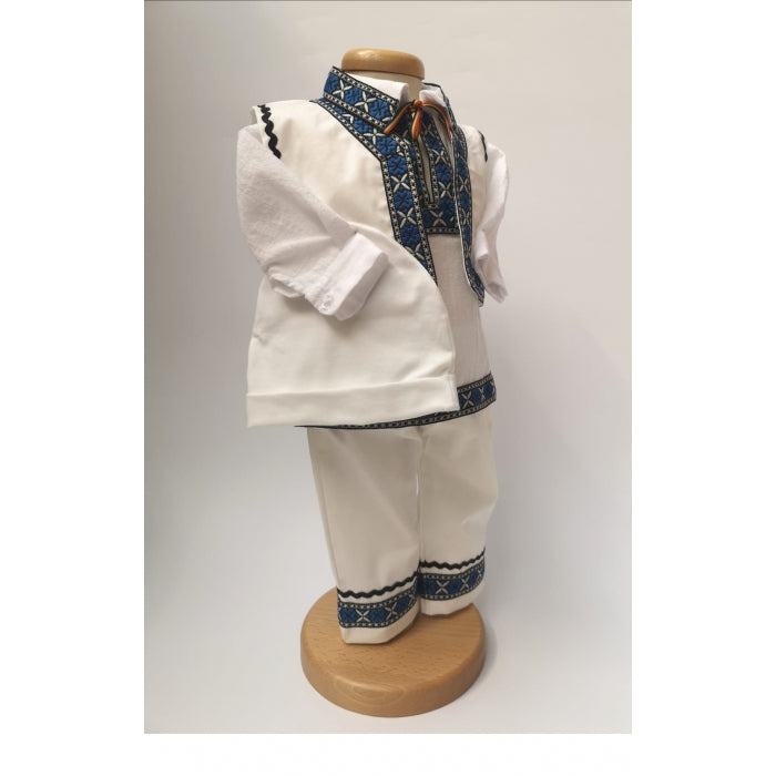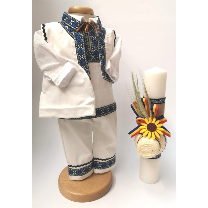 Costumas popular traditional romanesc pentru botez. Include camasa bumbac, vesta, pantalon, caciulita.