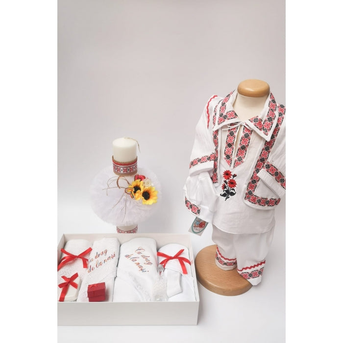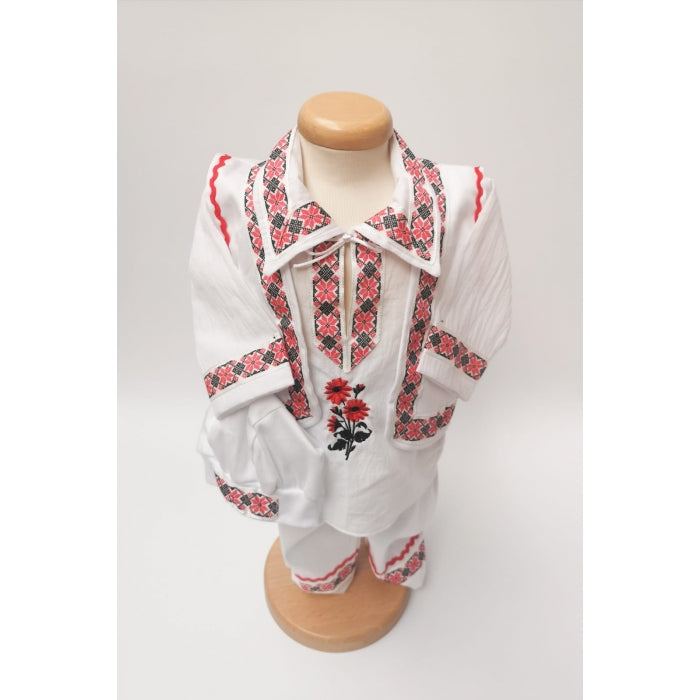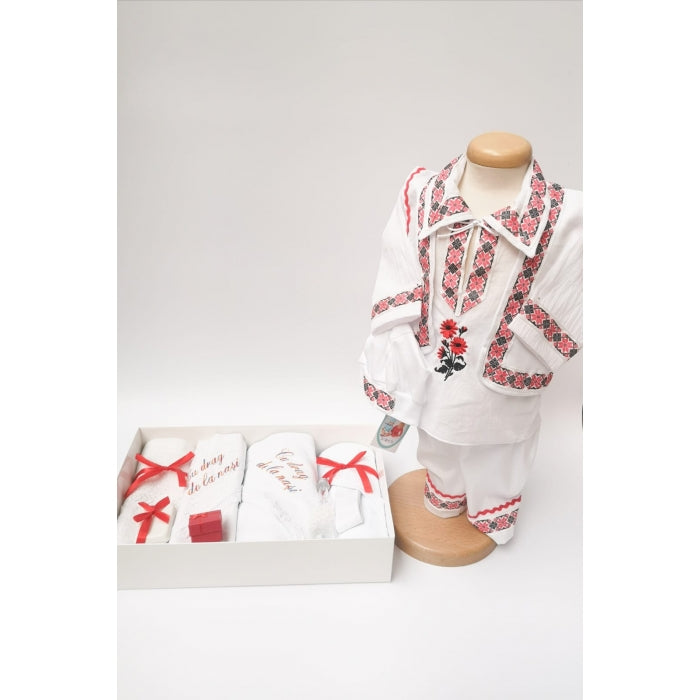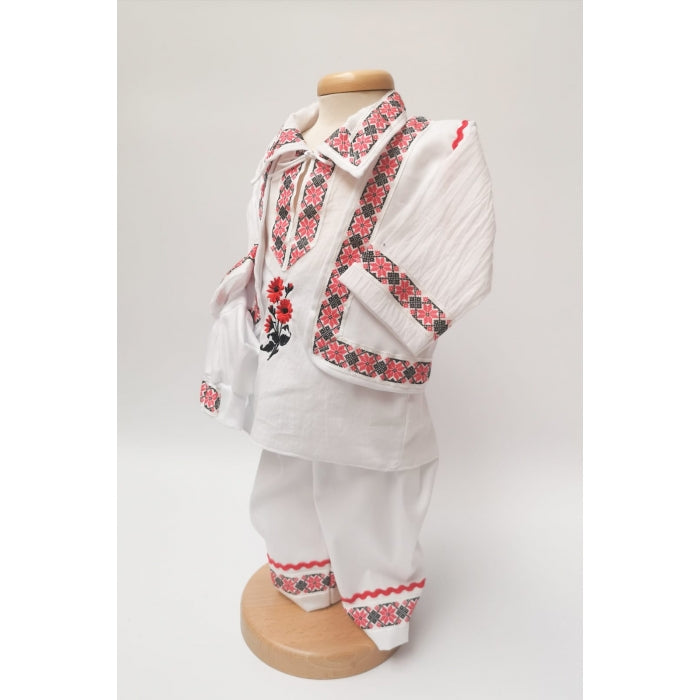 Costumas popular traditional romanesc pentru botez. Include camasa bumbac, vesta, pantalon, caciulita.