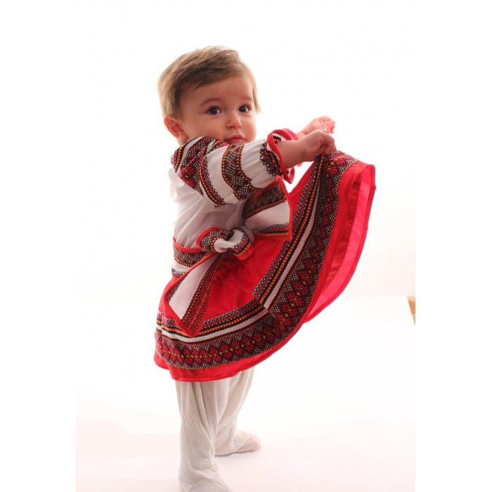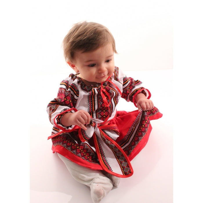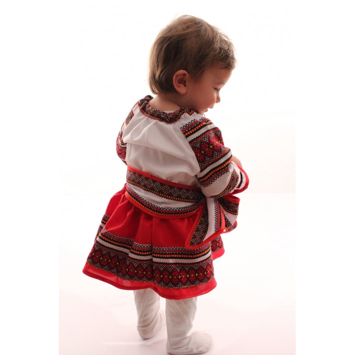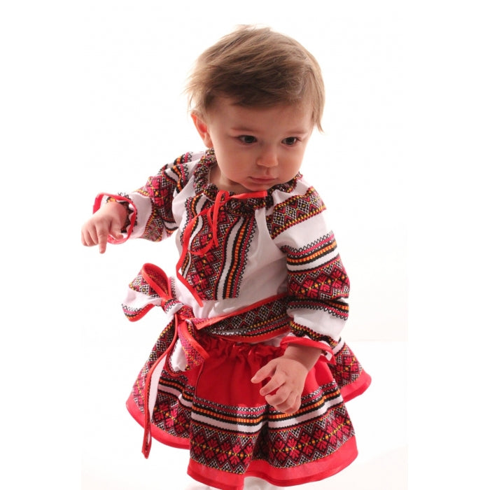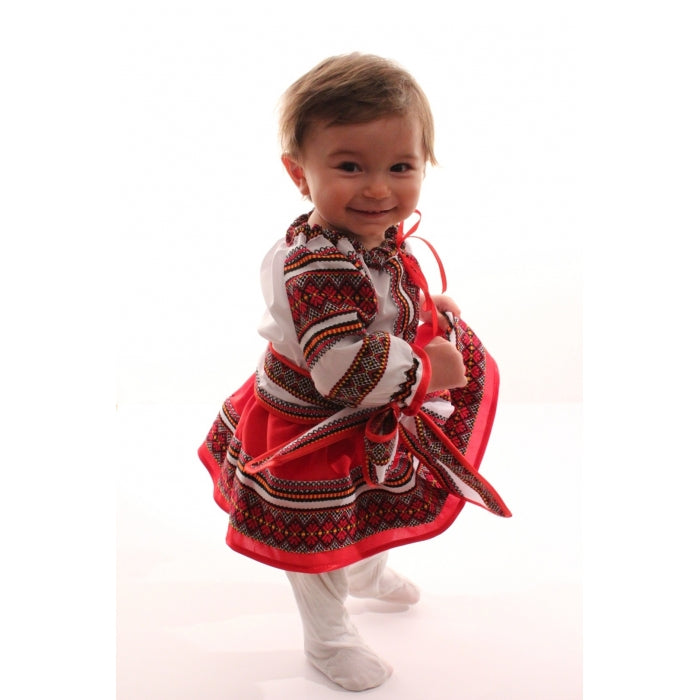 Costumas popular traditional romanesc pentru botez. Include bluza cu model traditional, fustita rosie si brau lat tip funda. Material bluza amestec bumbac, sintetic. Material fusta si brau: amestec sintetic