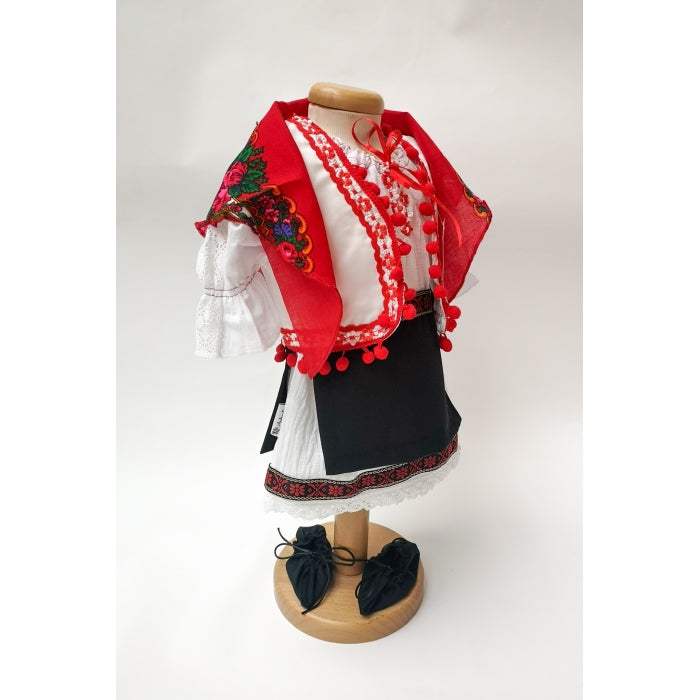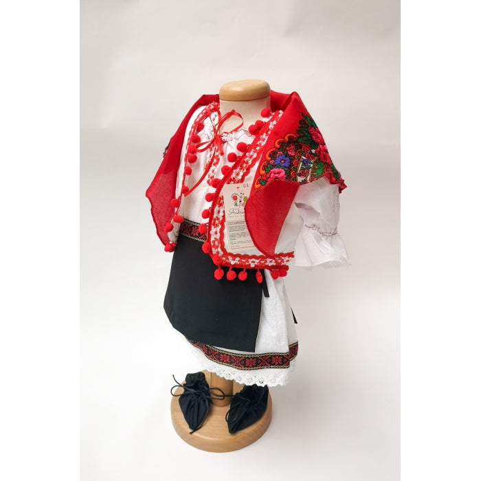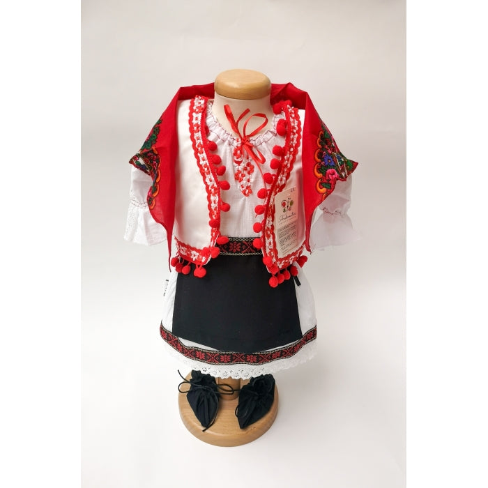 Costumas popular traditional romanesc pentru botez. Include vesta, camasa bumbac, batic, opincute, fota.