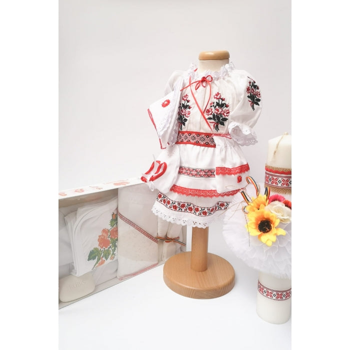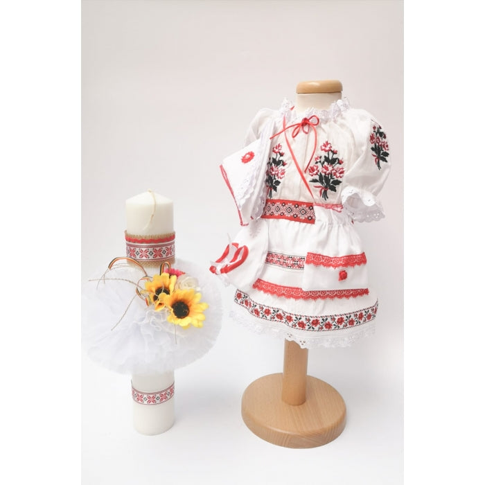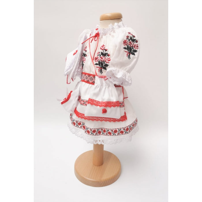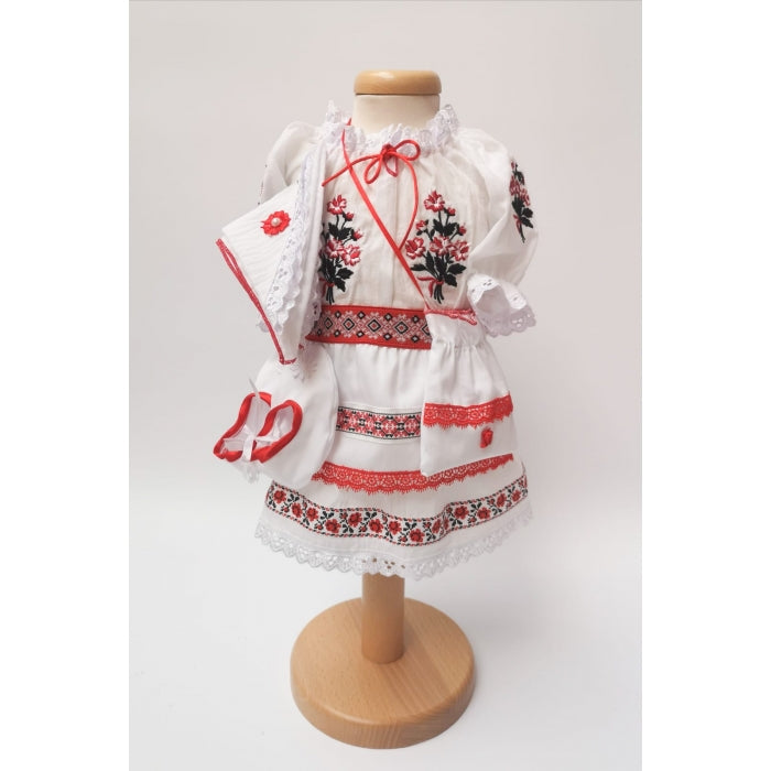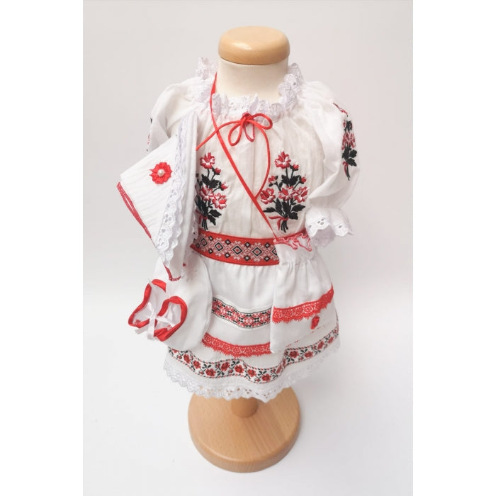 Costumas popular traditional romanesc pentru botez. Include, camasa bumbac, fota, batic, botosei, traista.