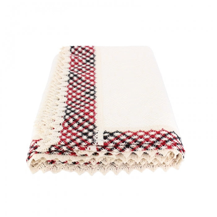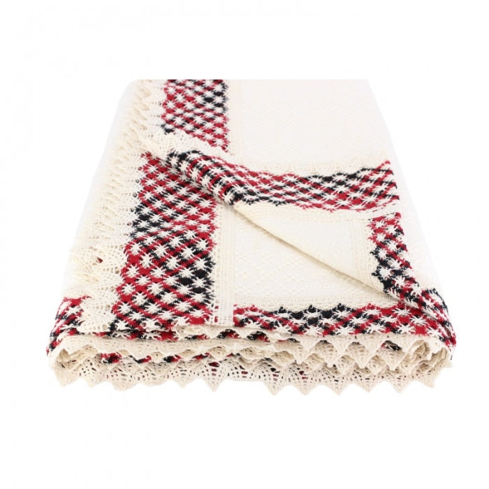 Fata de masa tesuta din bumbac la razboiul de tesut, cu motive traditionale romanesti si dantela pe margine. Forma dreptunghiulara.