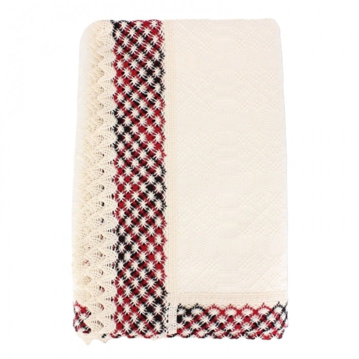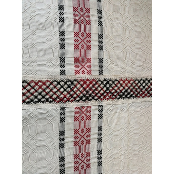 Fata de masa tesuta din bumbac la razboiul de tesut, cu motive traditionale romanesti si dantela pe margine. Forma dreptunghiulara. Produs in Romania.