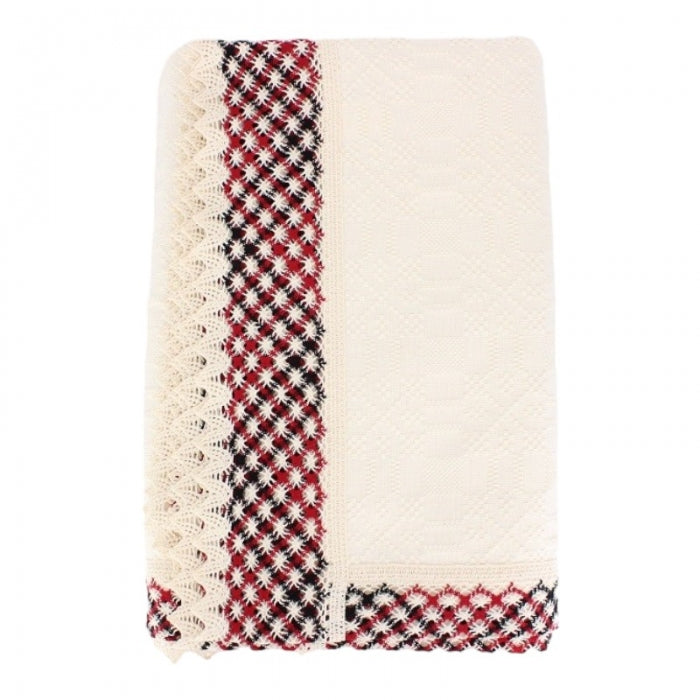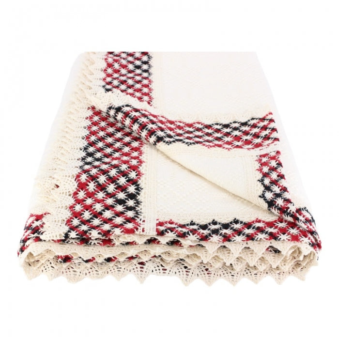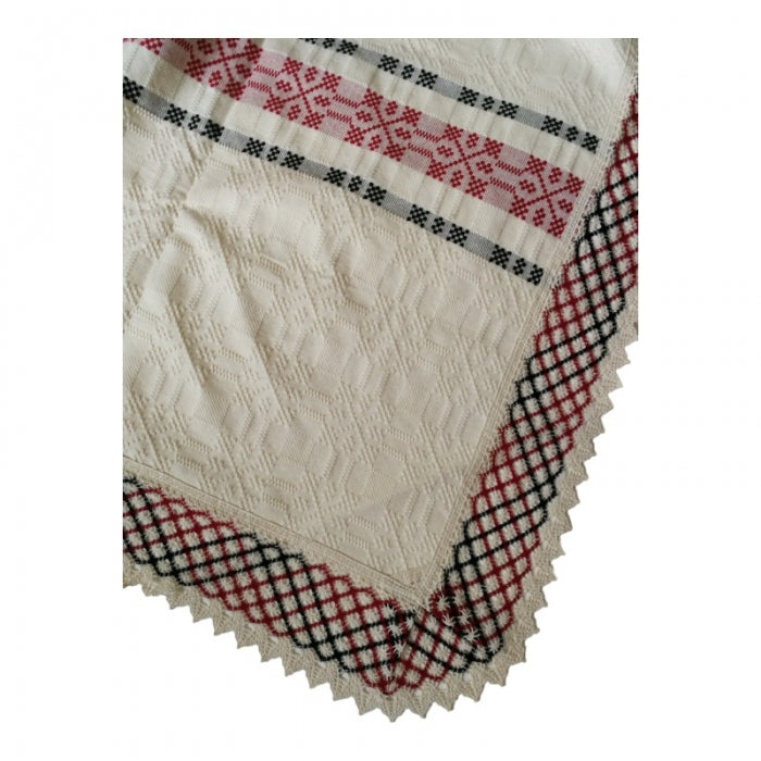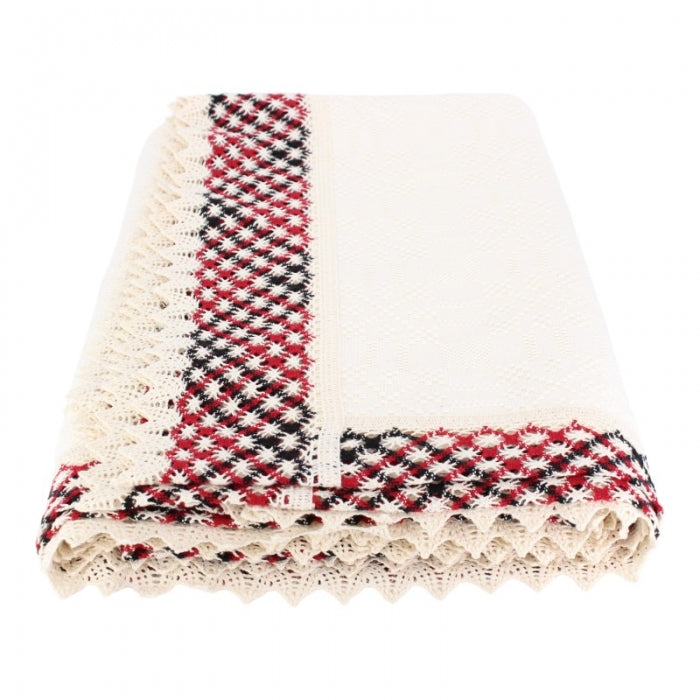 Fata de masa tesuta din bumbac la razboiul de tesut, cu motive traditionale romanesti si dantela pe margine. Forma dreptunghiulara. Produs in Romania.