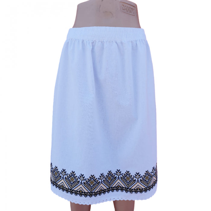 Fusta albă cu motive tradiționale este un omagiu adus portului popular românesc, îmbinând tradiția cu confortul modern. Este ideală pentru cei care doresc să își exprime dragostea pentru cultura românească prin vestimentație. Disponibilă în mai multe mărimi, aceasta se potrivește perfect oricărui tip de siluetă.