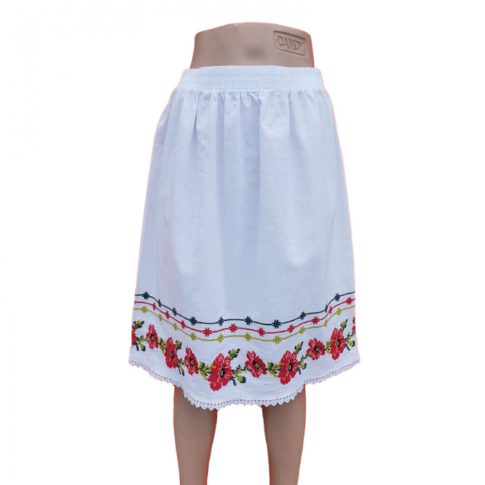 Fusta albă cu motive tradiționale este un omagiu adus portului popular românesc, îmbinând tradiția cu confortul modern. Este ideală pentru cei care doresc să își exprime dragostea pentru cultura românească prin vestimentație. Disponibilă în mai multe mărimi, aceasta se potrivește perfect oricărui tip de siluetă.