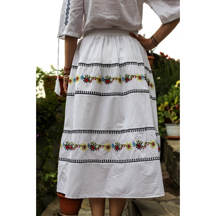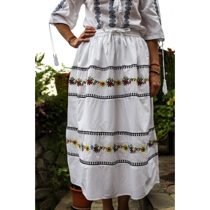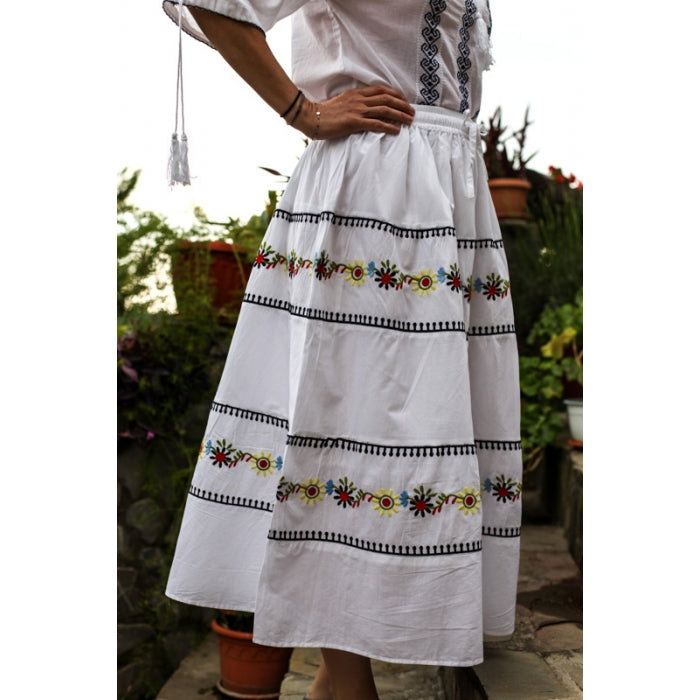 Fusta cu model traditional romanesc brodat la masina, cu elastic in talie, necaptusita, din bumbac 100%.