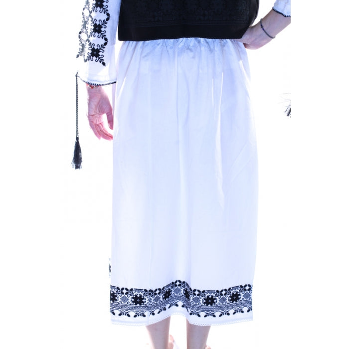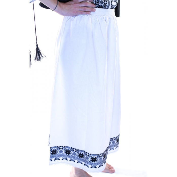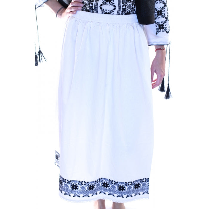 Fusta cu model traditional romanesc brodat la masina, cu elastic in talie, necaptusita, din bumbac 100%.
