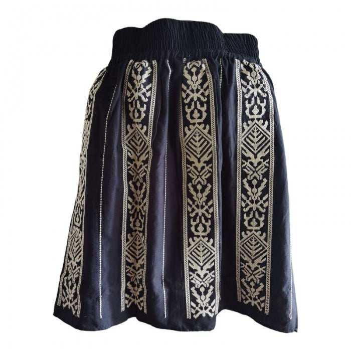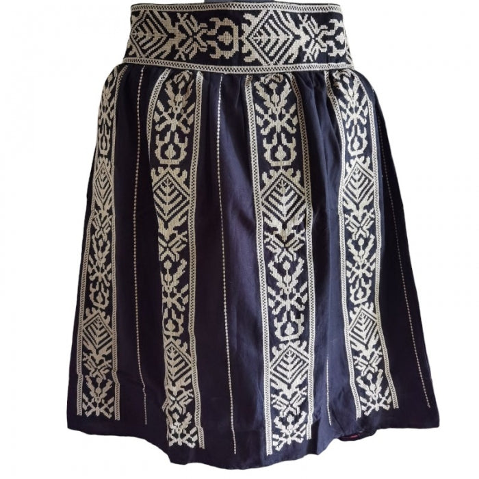 Fusta cu model traditional romanesc brodat la masina, cu elastic in talie, necaptusita, din bumbac 100%.