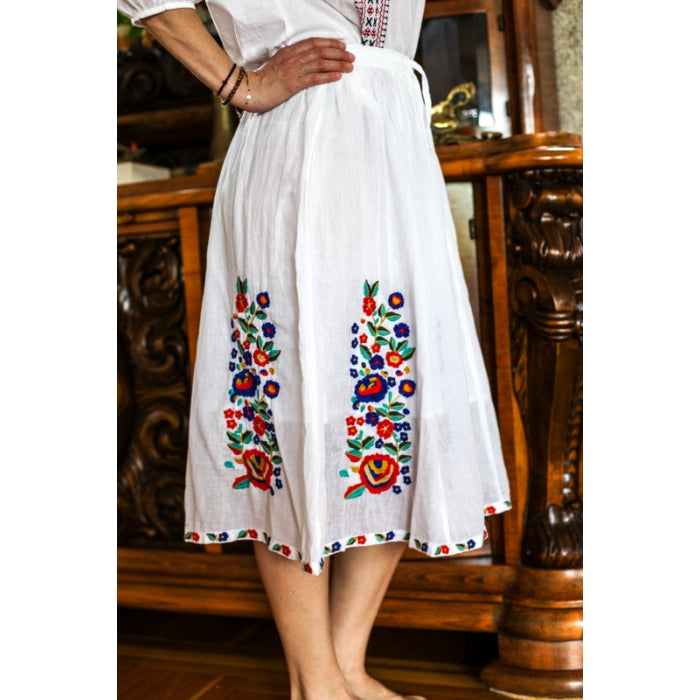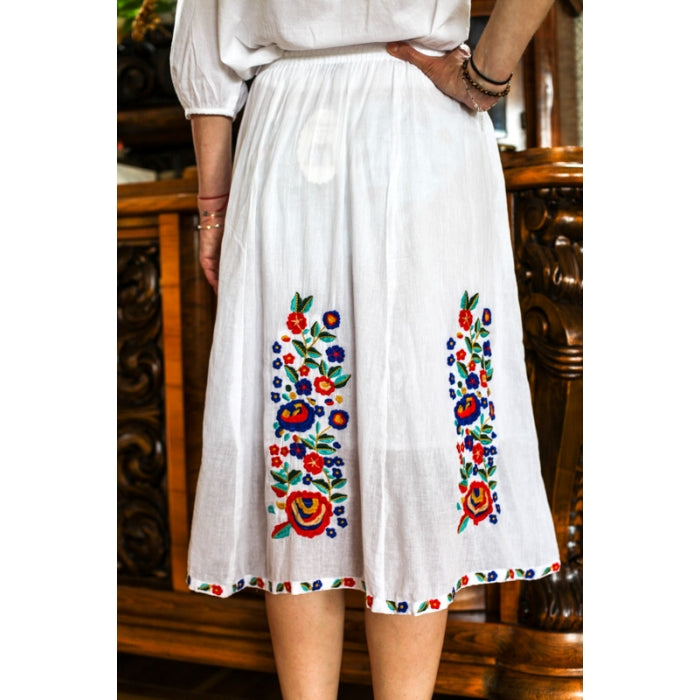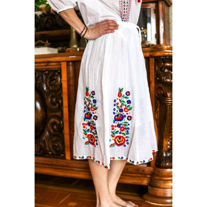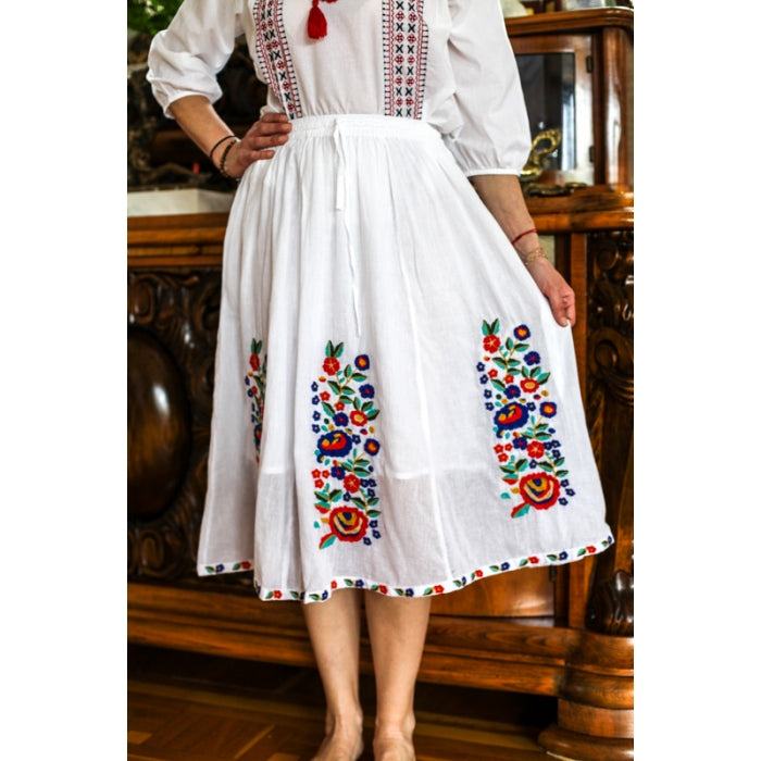 Fusta cu model traditional romanesc brodat la masina, cu elastic in talie, necaptusita, din bumbac 100%.