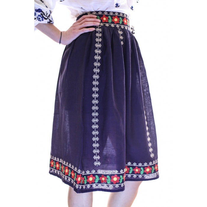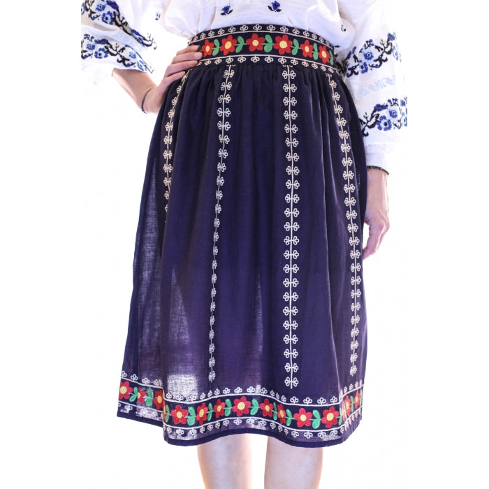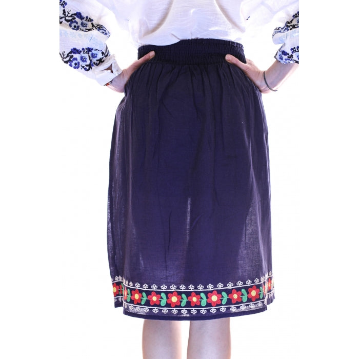Fusta cu model traditional romanesc brodat la masina, cu elastic in talie in partea din spate, captuseala din bumbac, material bumbac 100%.