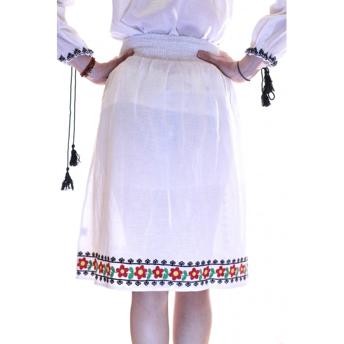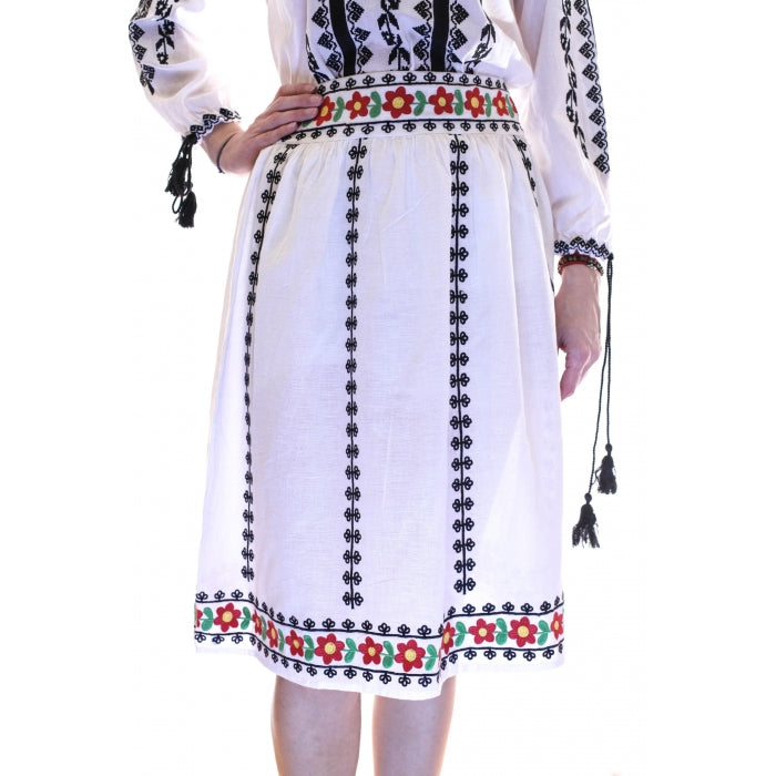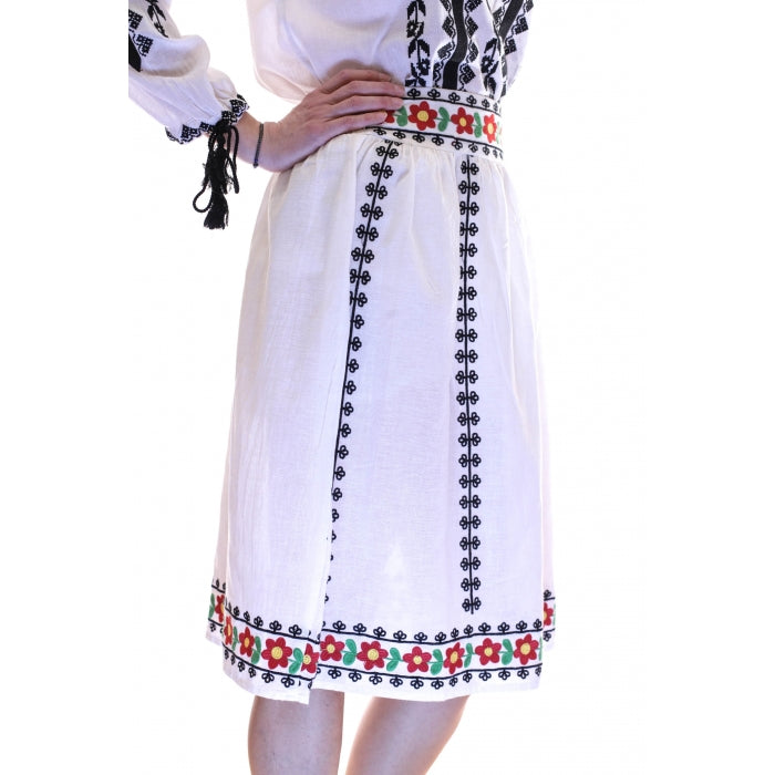 Fusta cu model traditional romanesc brodat la masina, cu elastic in talie in partea din spate, captuseala din bumbac, material bumbac 100%.