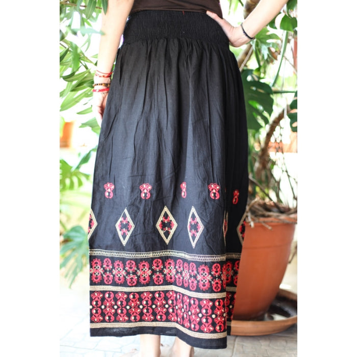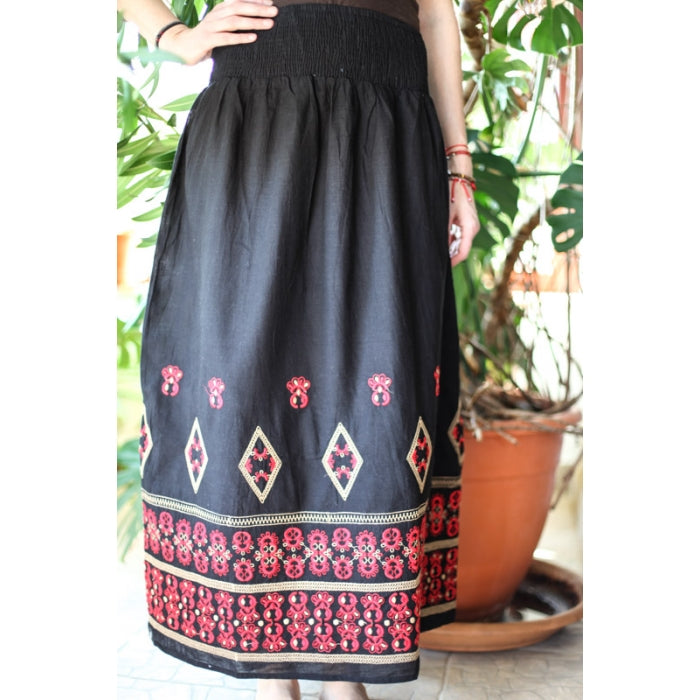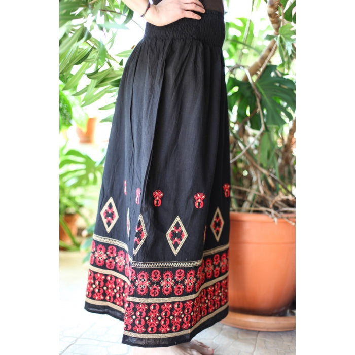 Fusta cu model traditional romanesc brodat la masina, cu elastic in talie, necaptusita, din bumbac 100%.