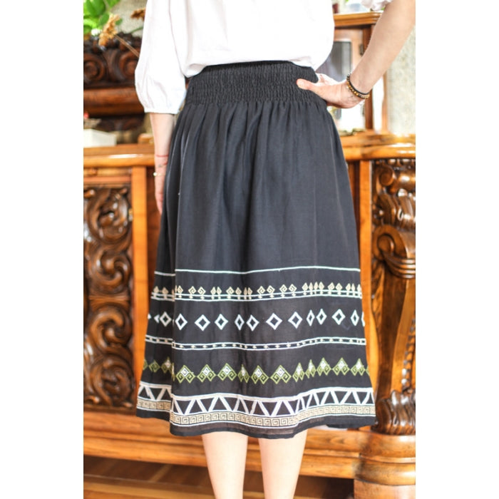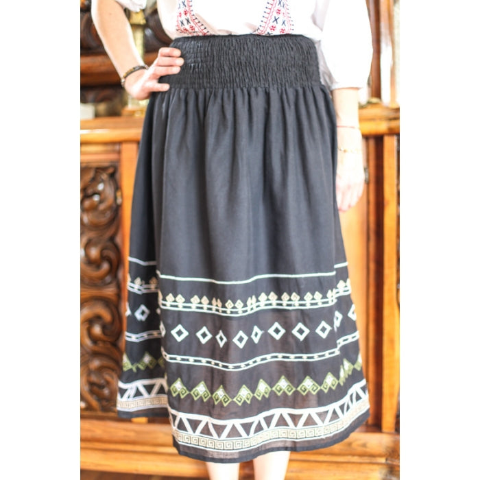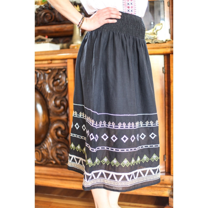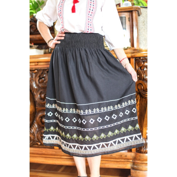 Fusta cu model traditional romanesc brodat la masina, cu elastic in talie, necaptusita, din bumbac 100%.