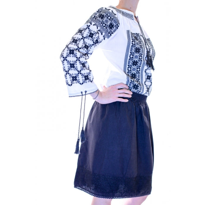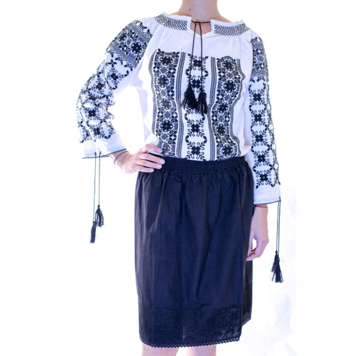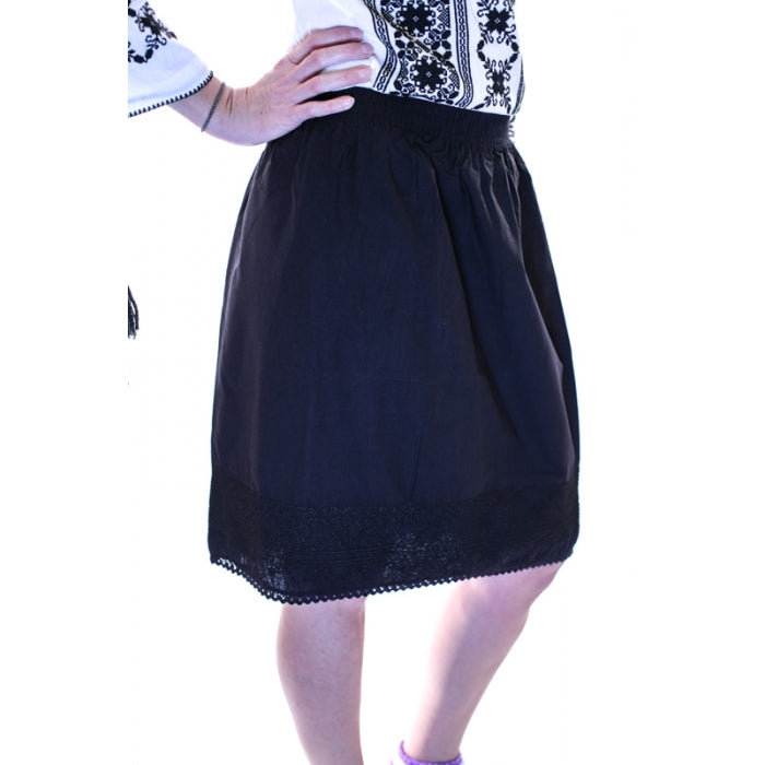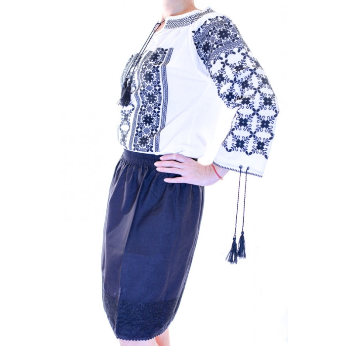 Fusta cu model traditional romanesc brodat la masina, cu elastic in talie in partea din spate, captuseala din bumbac, material bumbac 100%.