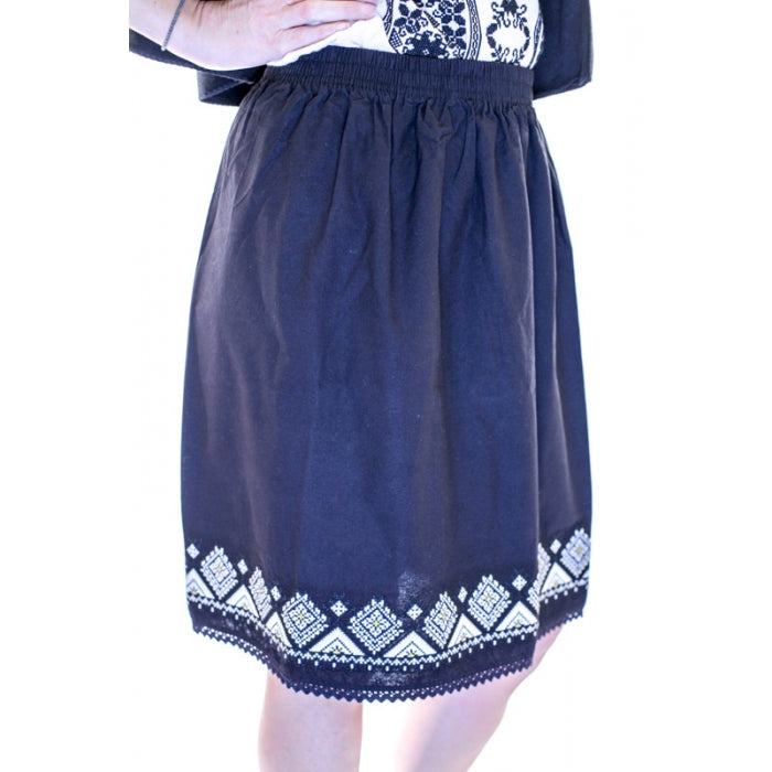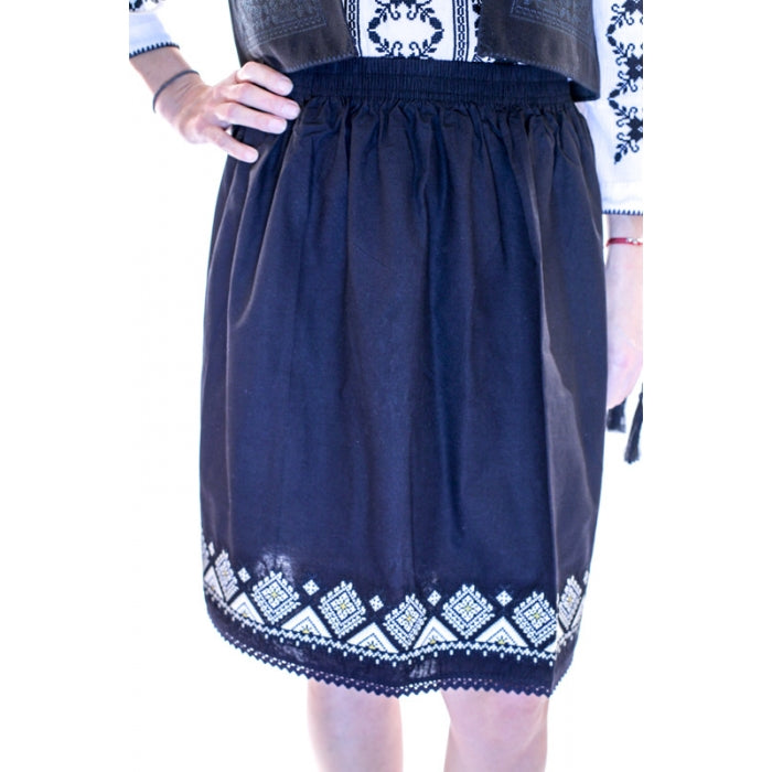 Fusta cu model traditional romanesc brodat la masina, cu elastic in talie in partea din spate, captuseala din bumbac, material bumbac 100%.