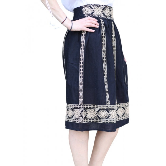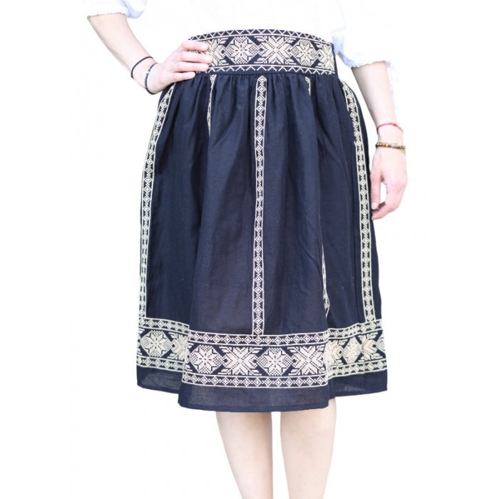 Fusta cu model traditional romanesc brodat la masina, cu elastic in talie, necaptusita, din bumbac 100%.