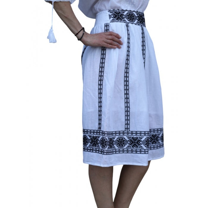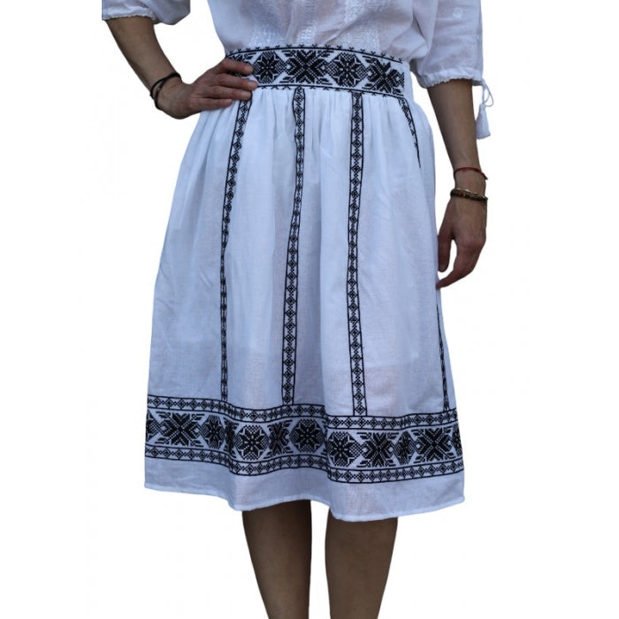 Fusta cu model traditional romanesc brodat la masina, cu elastic in talie, necaptusita, din bumbac 100%.