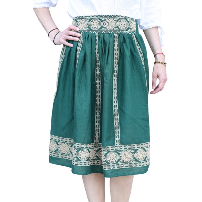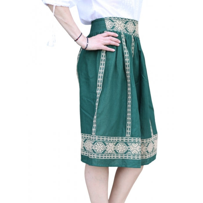 Fusta cu model traditional romanesc brodat la masina, cu elastic in talie, necaptusita, din bumbac 100%.