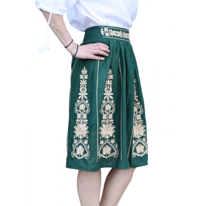 Redescoperă tradiția cu această fustă tradițională brodată, o piesă autentică ce îmbină arta populară românească cu eleganța modernă. Această fustă este decorată cu motive tradiționale elaborate, ce reînvie frumusețea și simbolistica folclorului românesc. Fusta este realizată din materiale naturale și respirabile, asigurând confortul pe tot parcursul zilei.